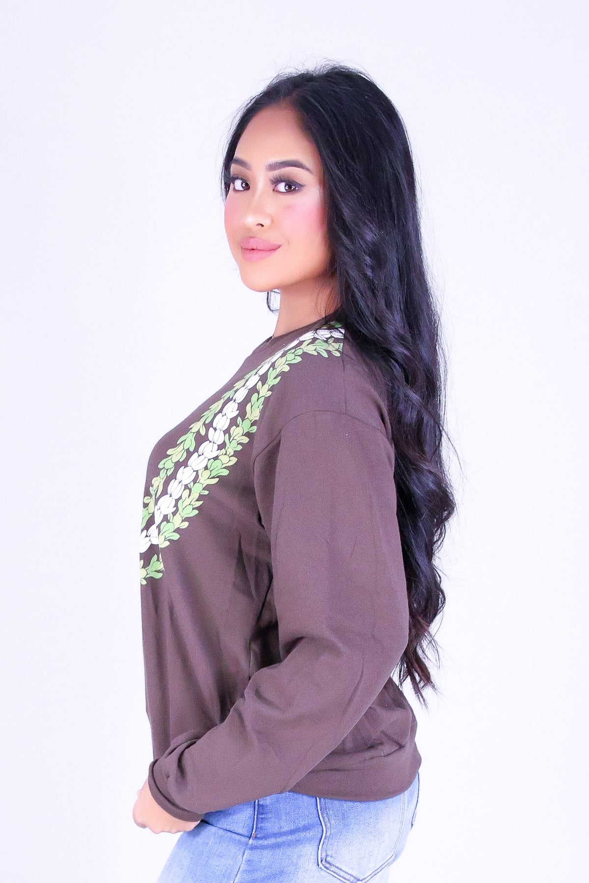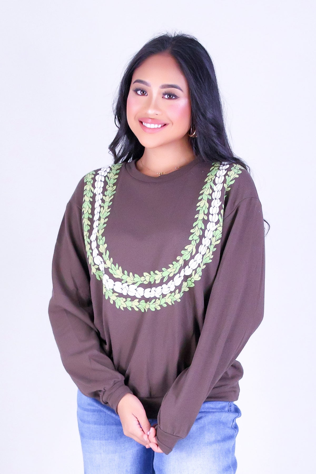 PAKALANA PIKAKE SWEATER is available in color BROWN and in size SMALL, MED, LARGE.