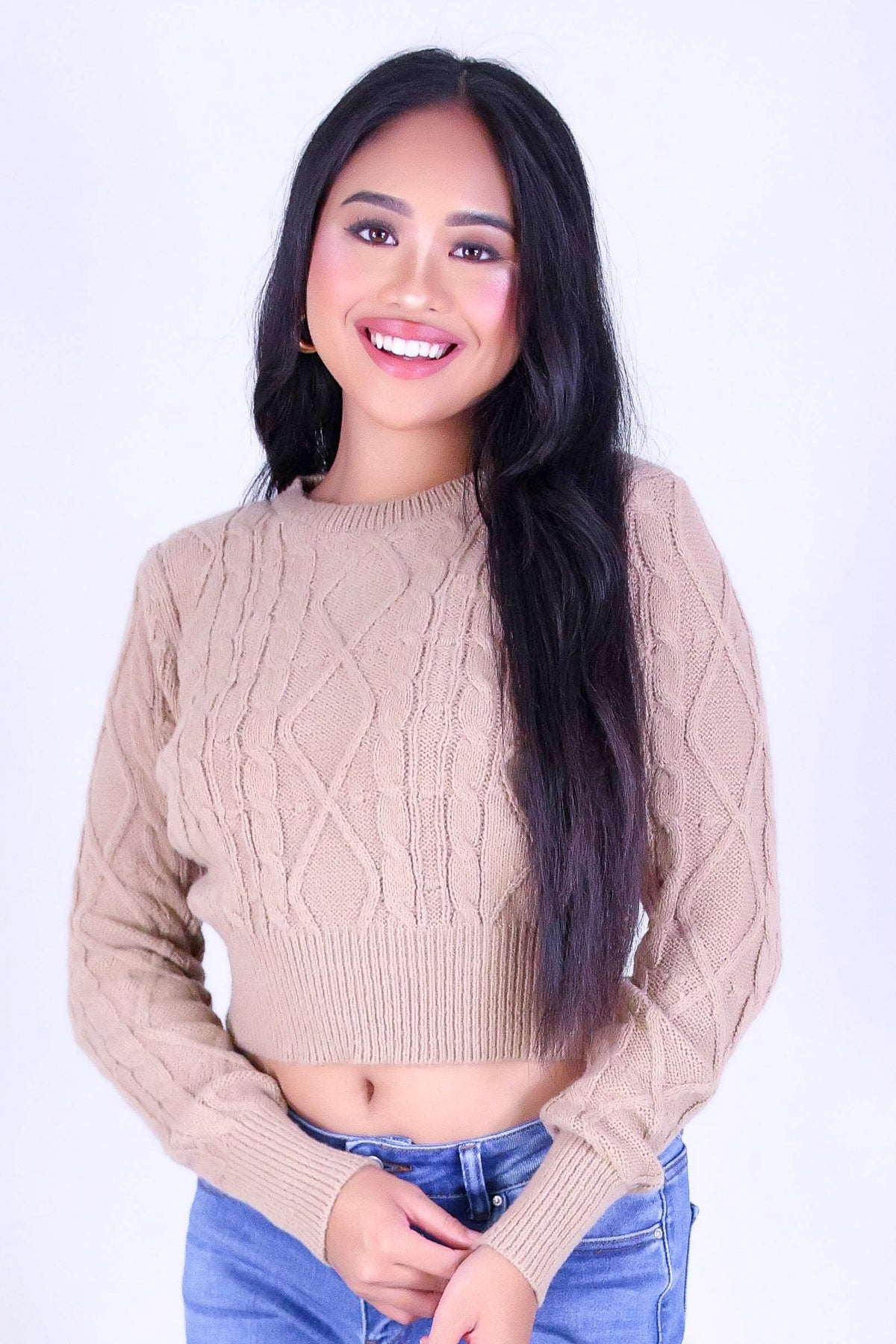 FIRESIDE TWIST SWEATER is available in color TAUPE and in size SMALL, MED, LARGE.