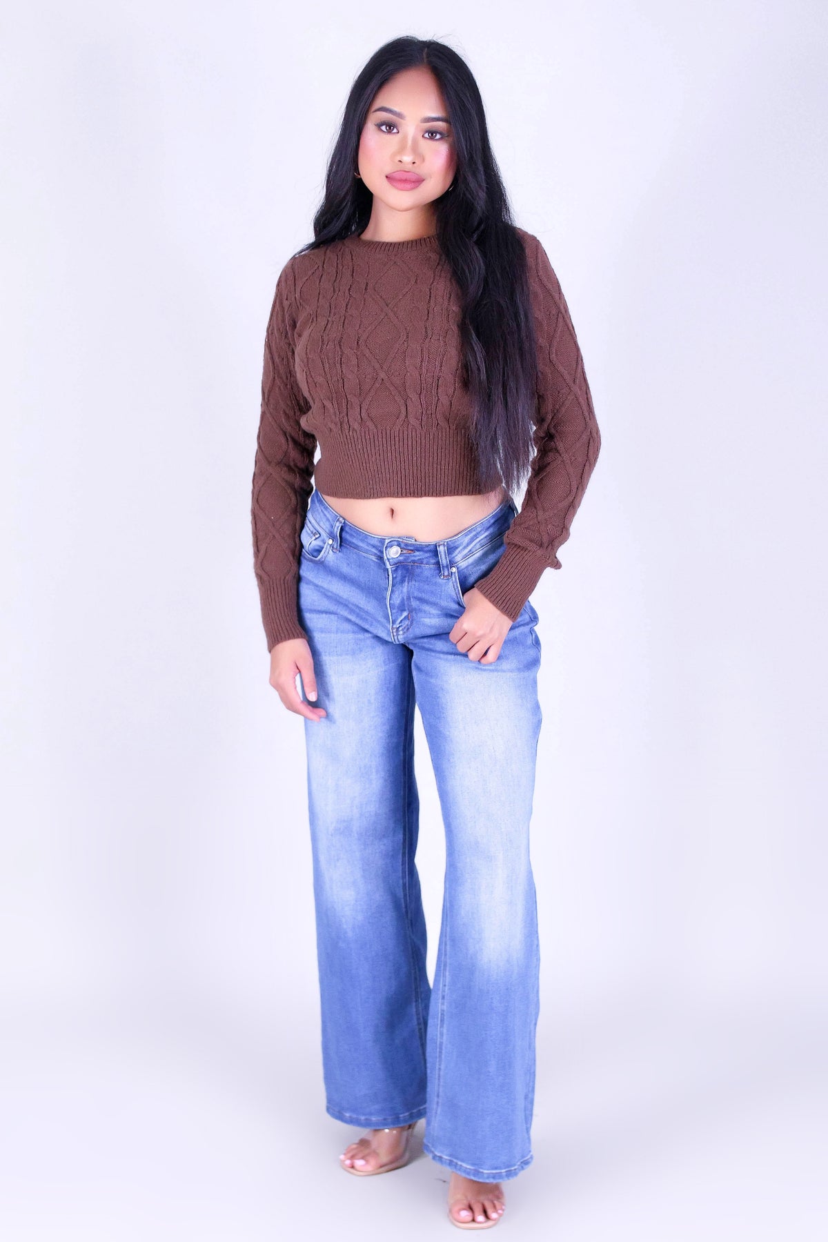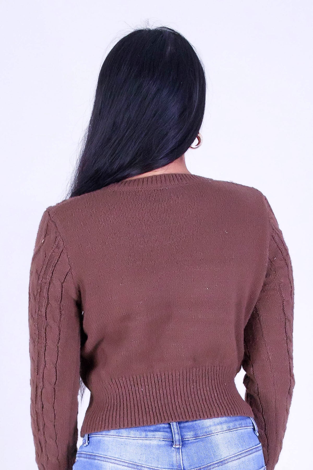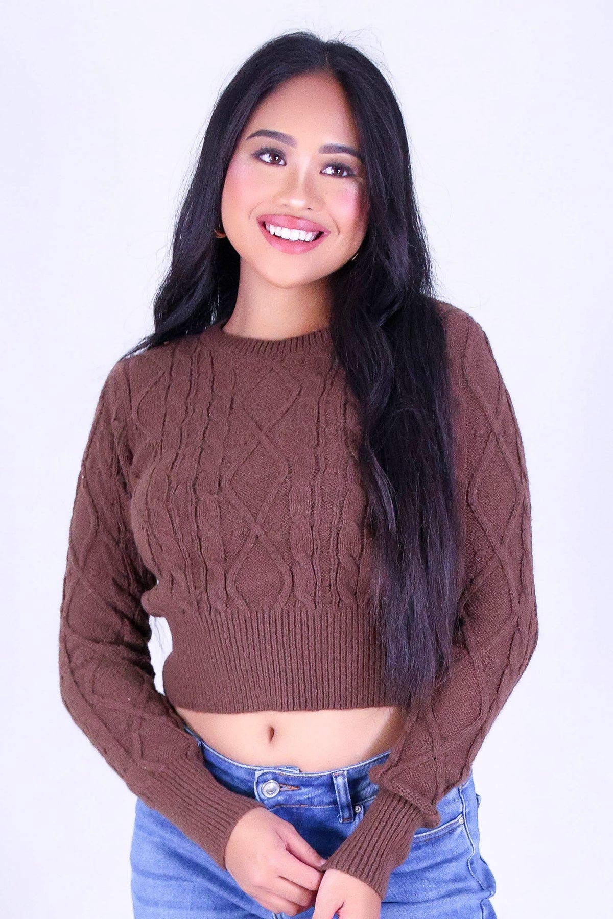 FIRESIDE TWIST SWEATER is available in color COFFEE and in size SMALL, MED, LARGE.