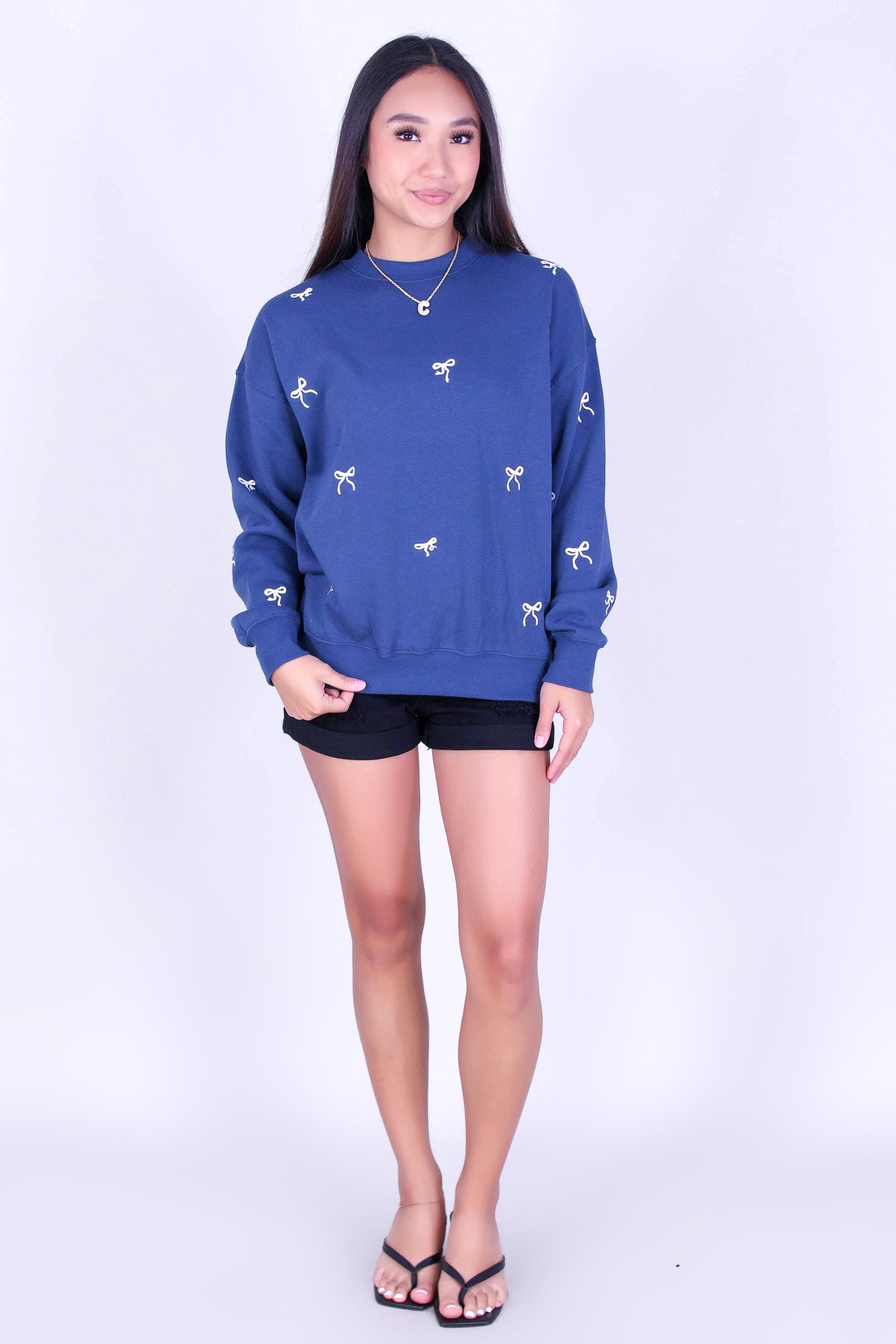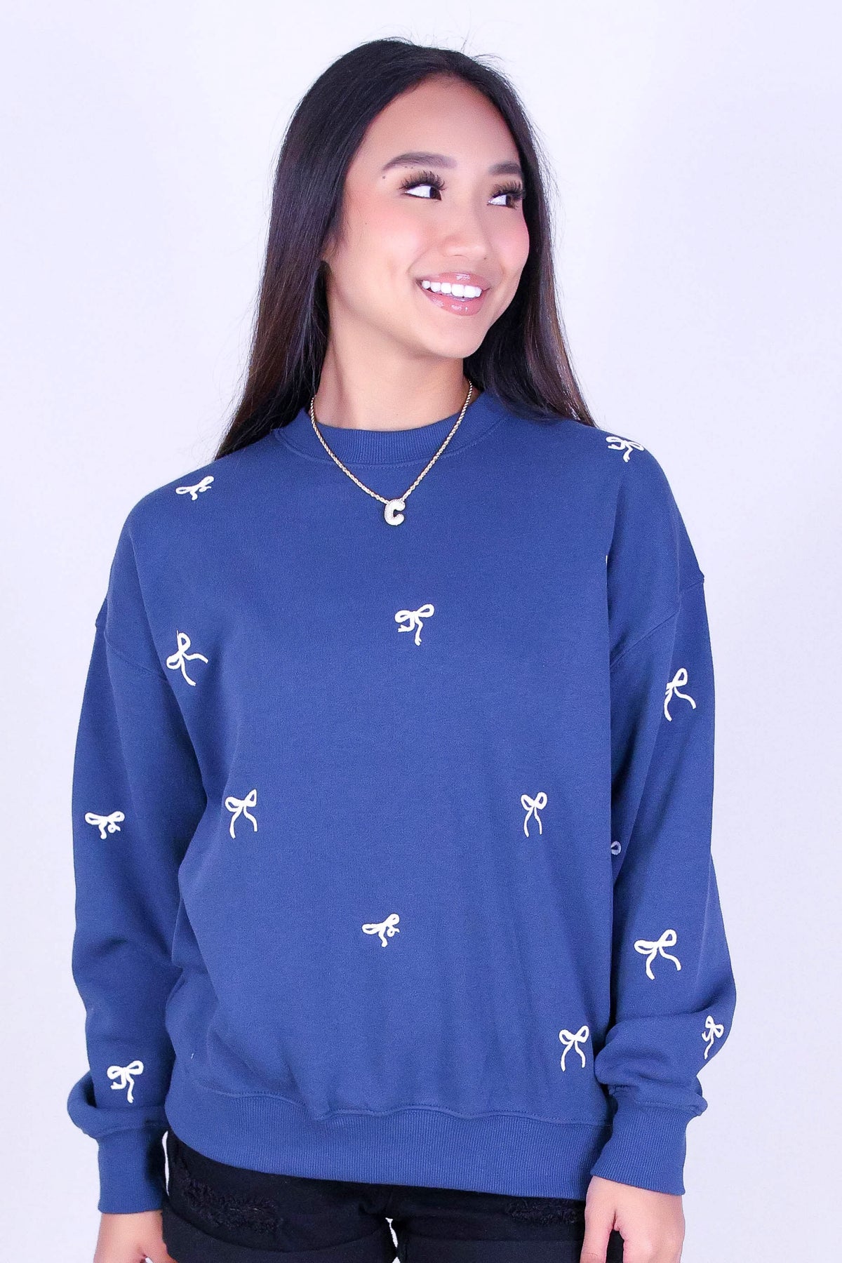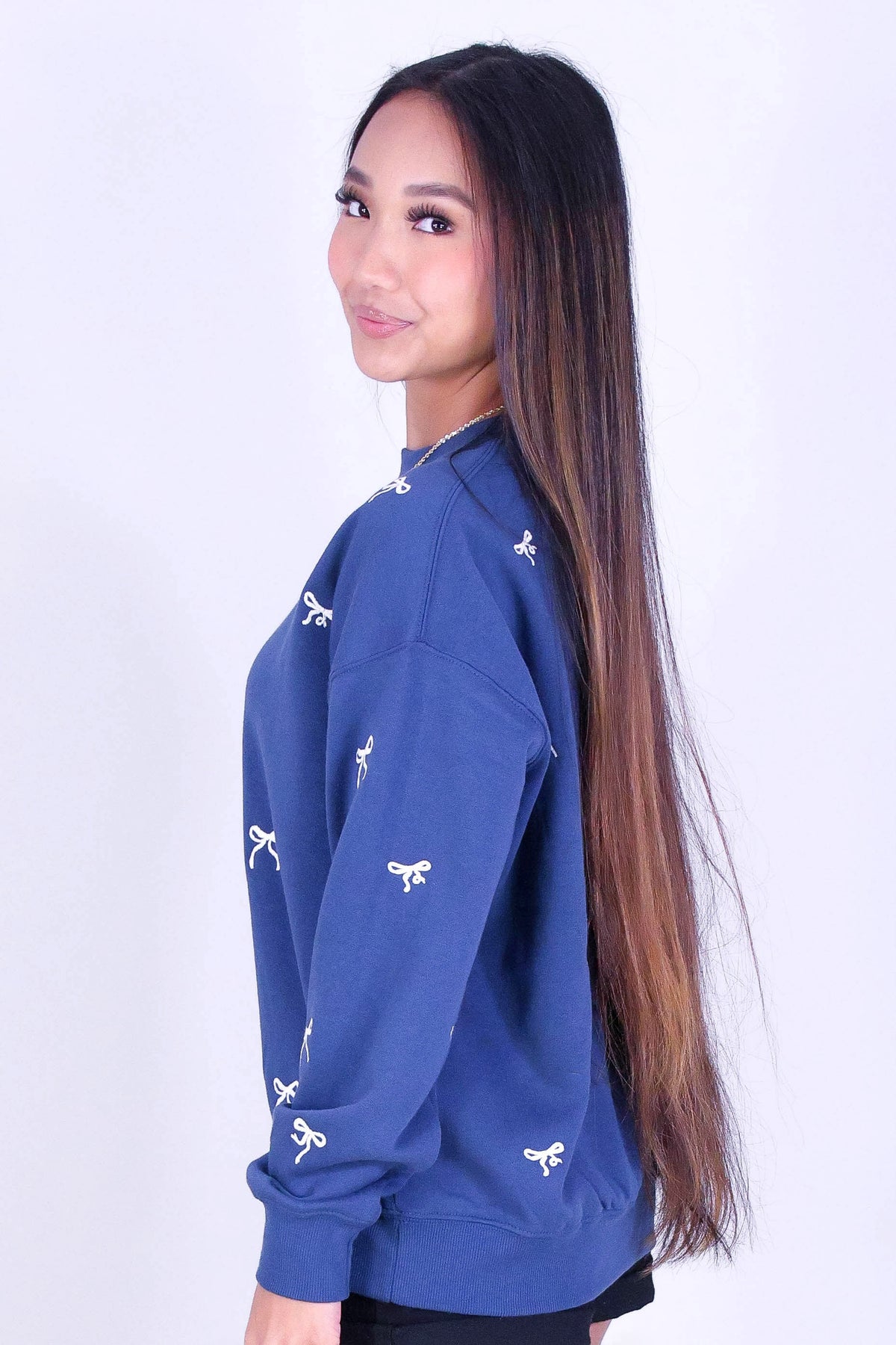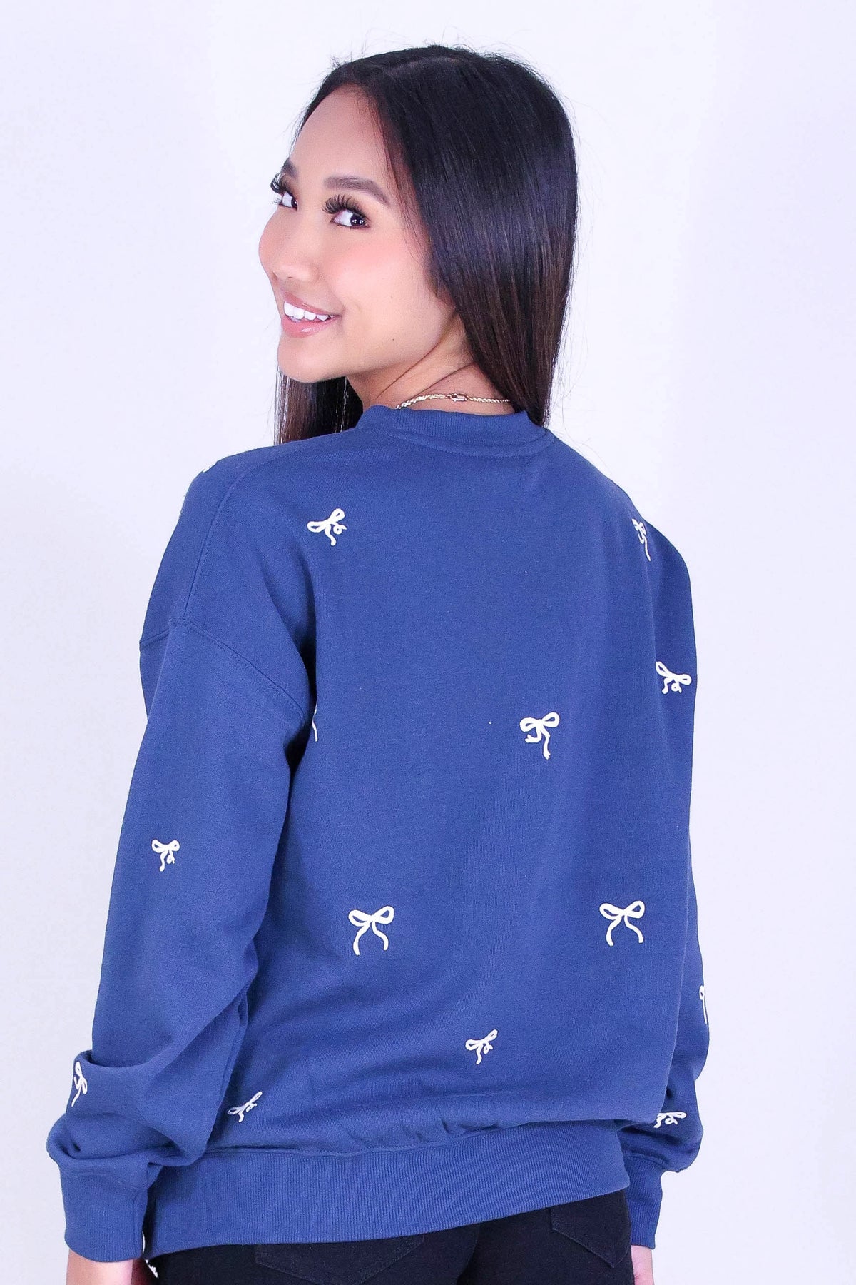 BOW EMBROIDERED CREW SWEATER is available in color INDIGO and in size SMALL, MED, LARGE.