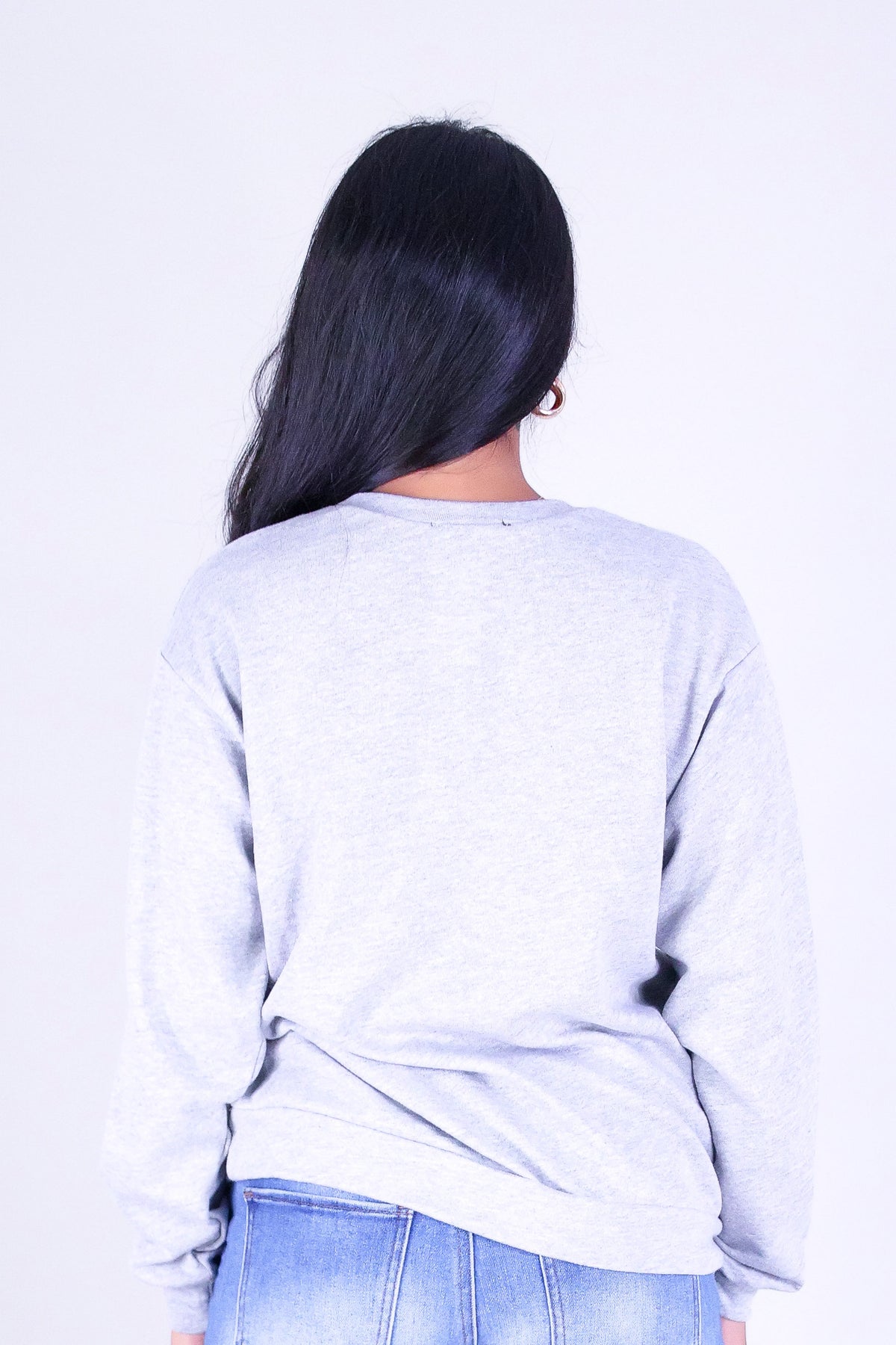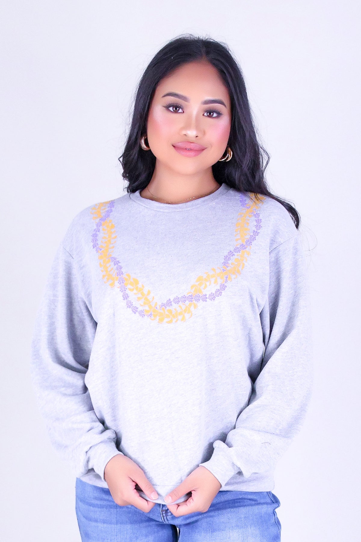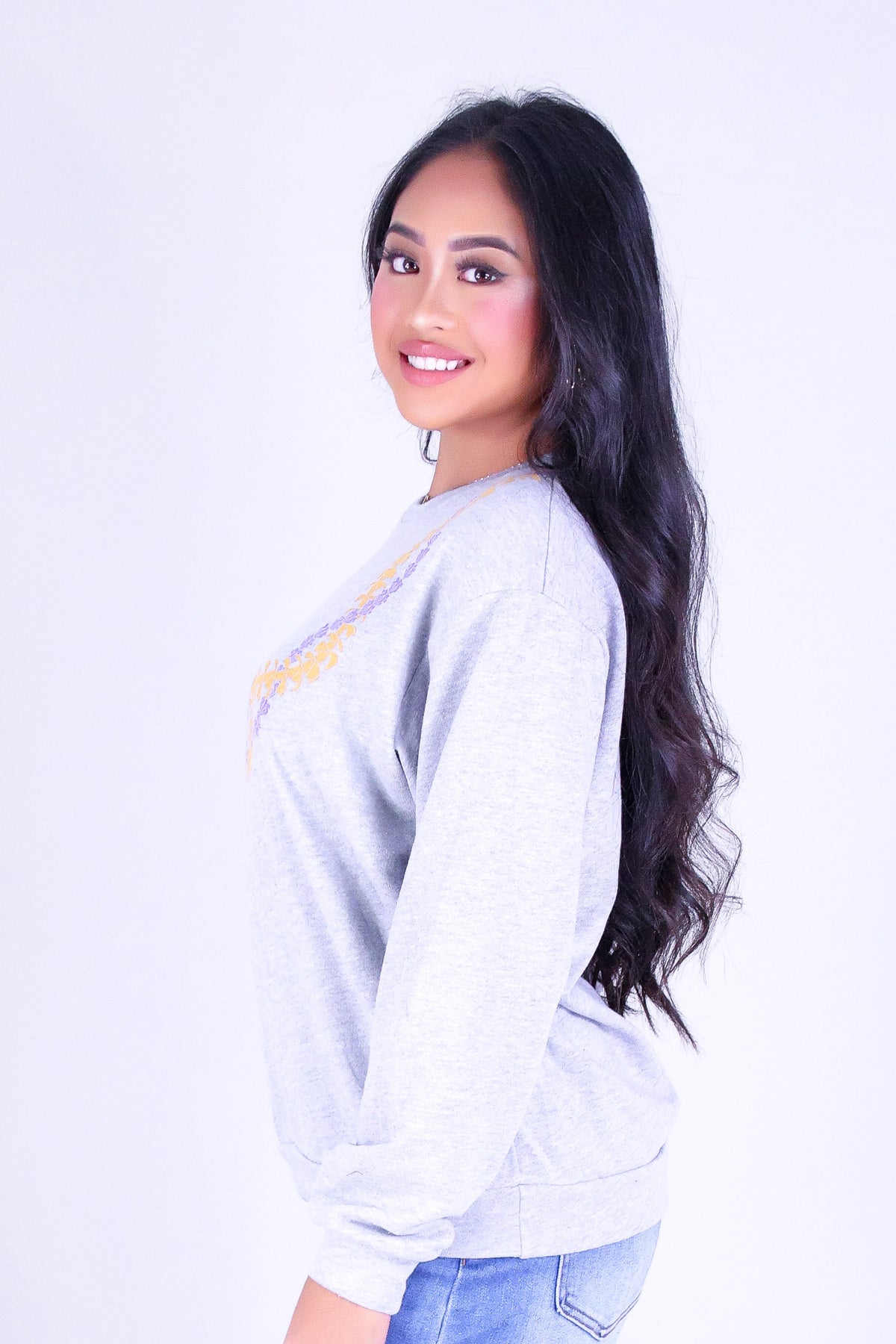 PUAKENIKENI CROWN FLOWER SWEATER is available in color H.GREY and in size SMALL, MED, LARGE.
