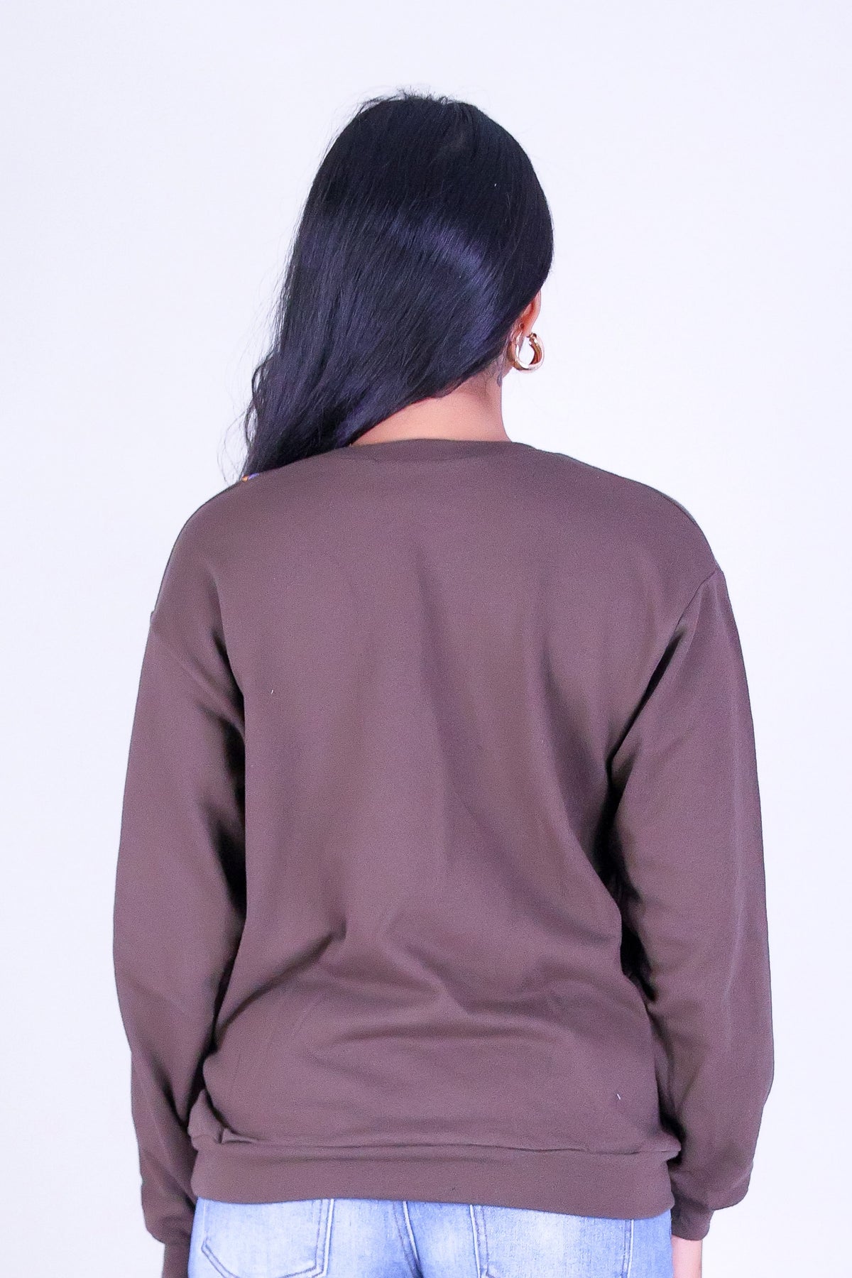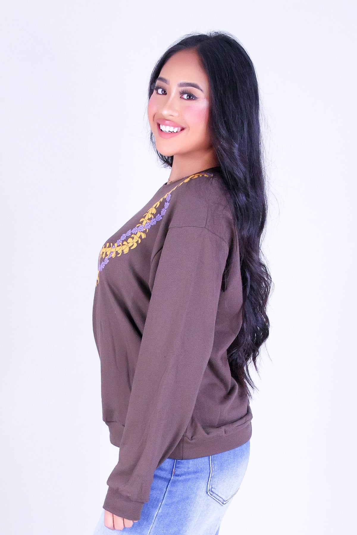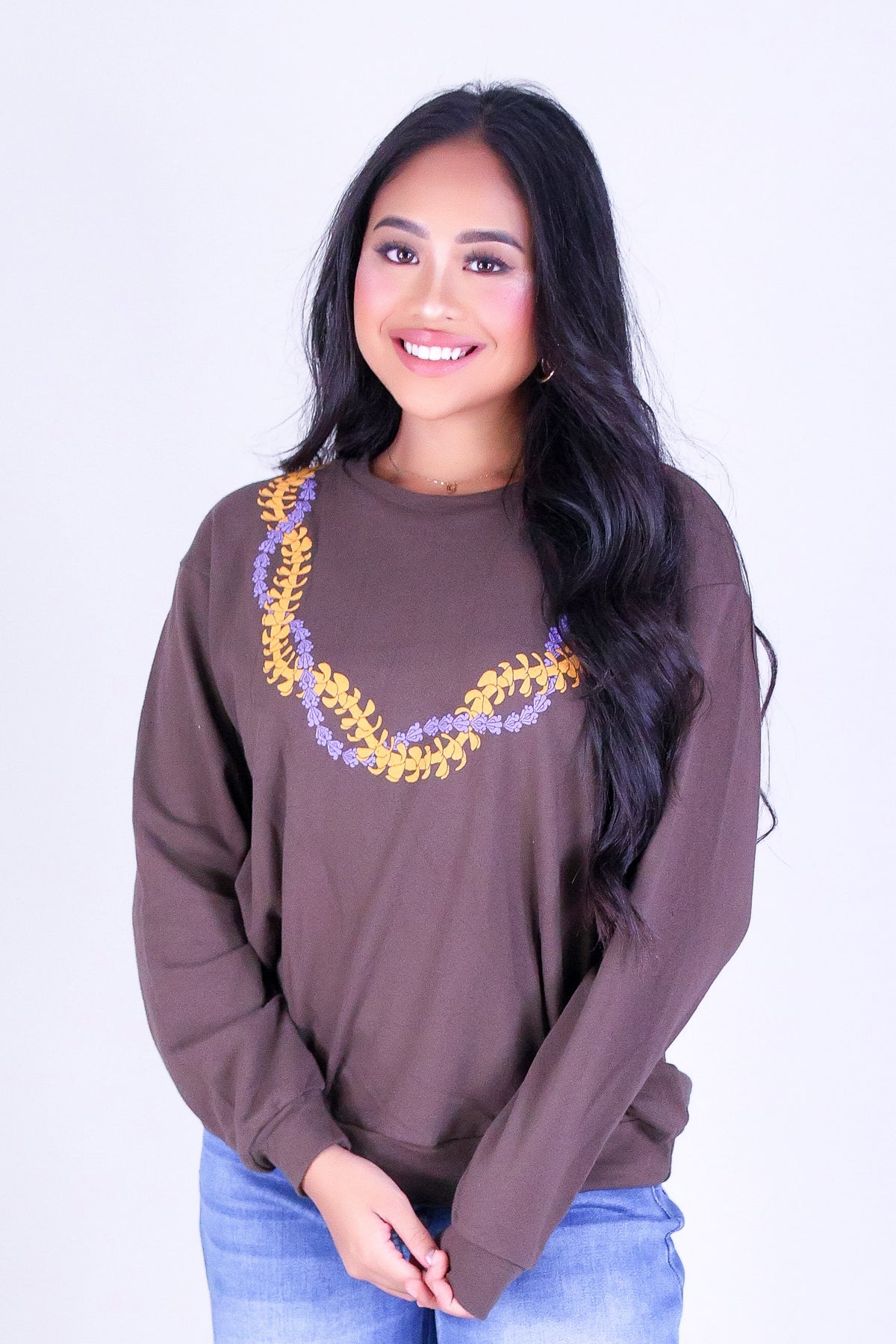 PUAKENIKENI CROWN FLOWER SWEATER is available in color BROWN and in size SMALL, MED, LARGE.