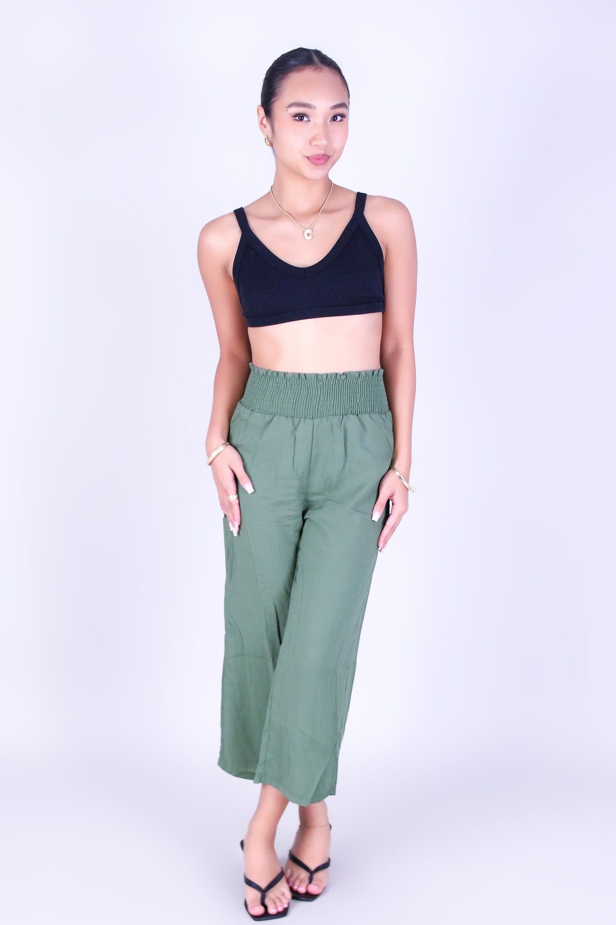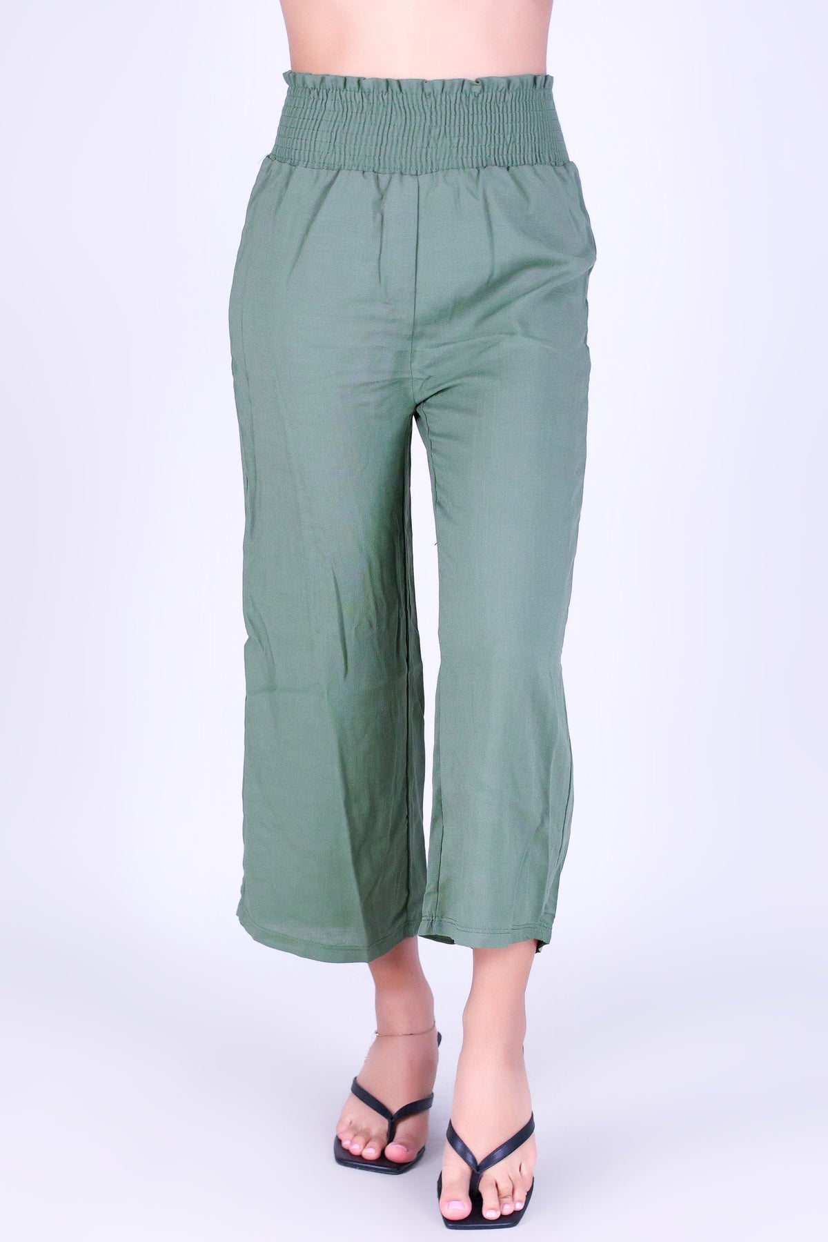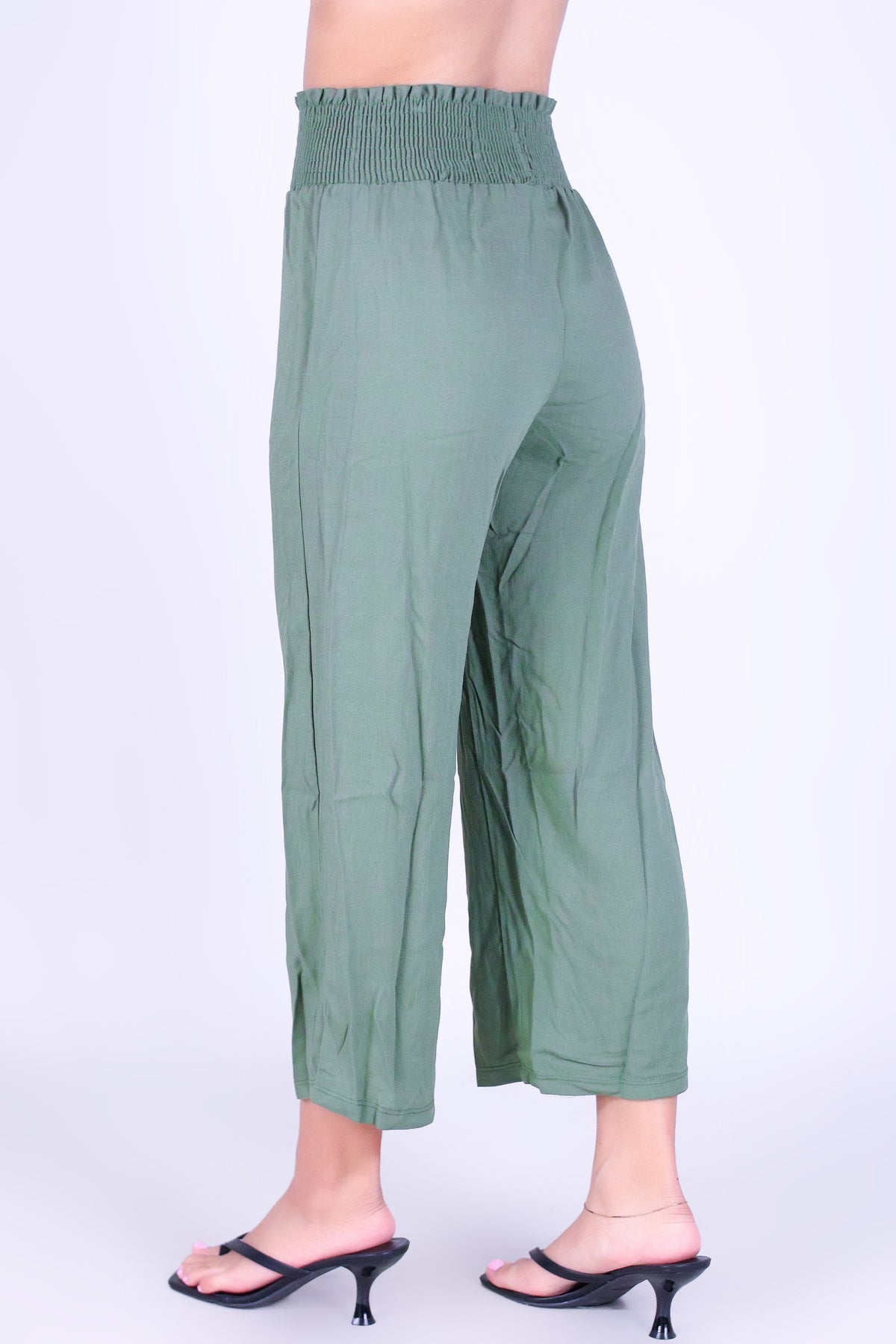 SOFT FLOW SMOCKED WAIST CAPRI'S is available in color OLIVE and in size SMALL, MED, LARGE, XL.