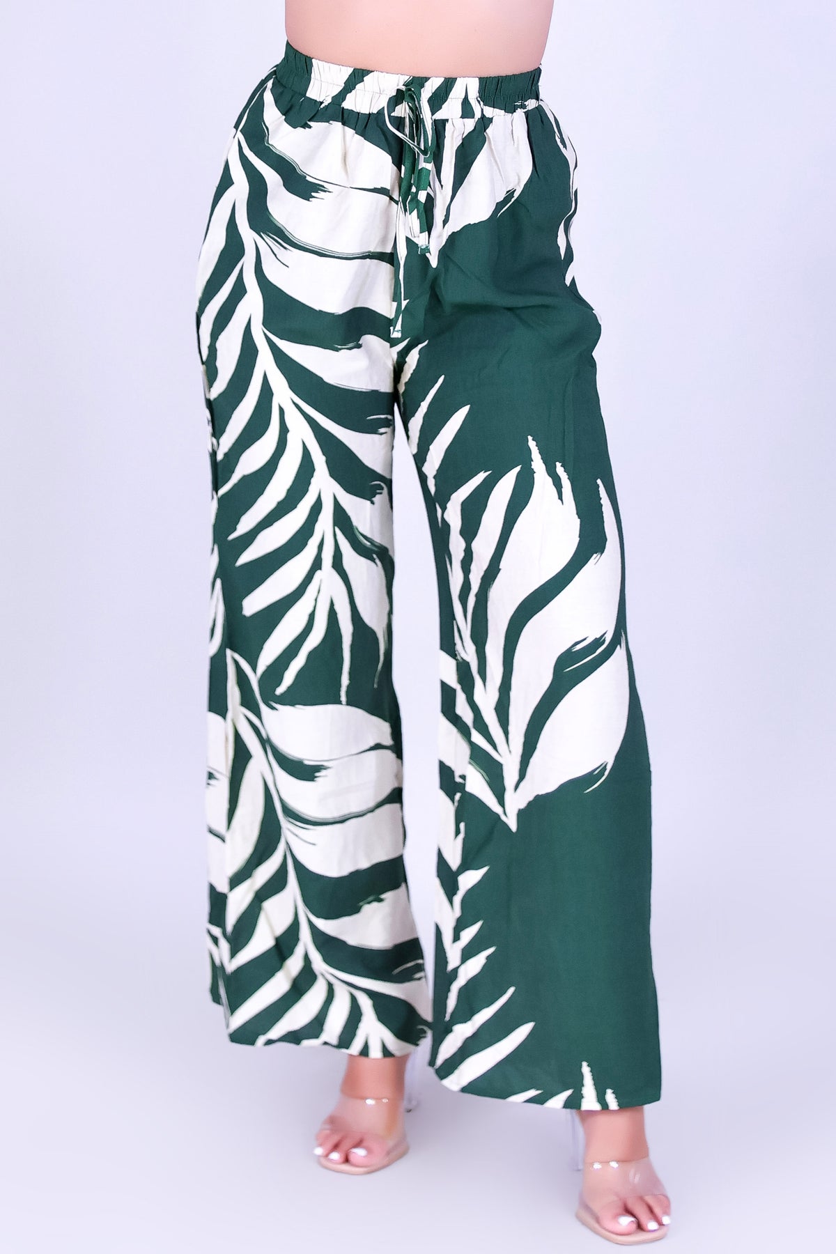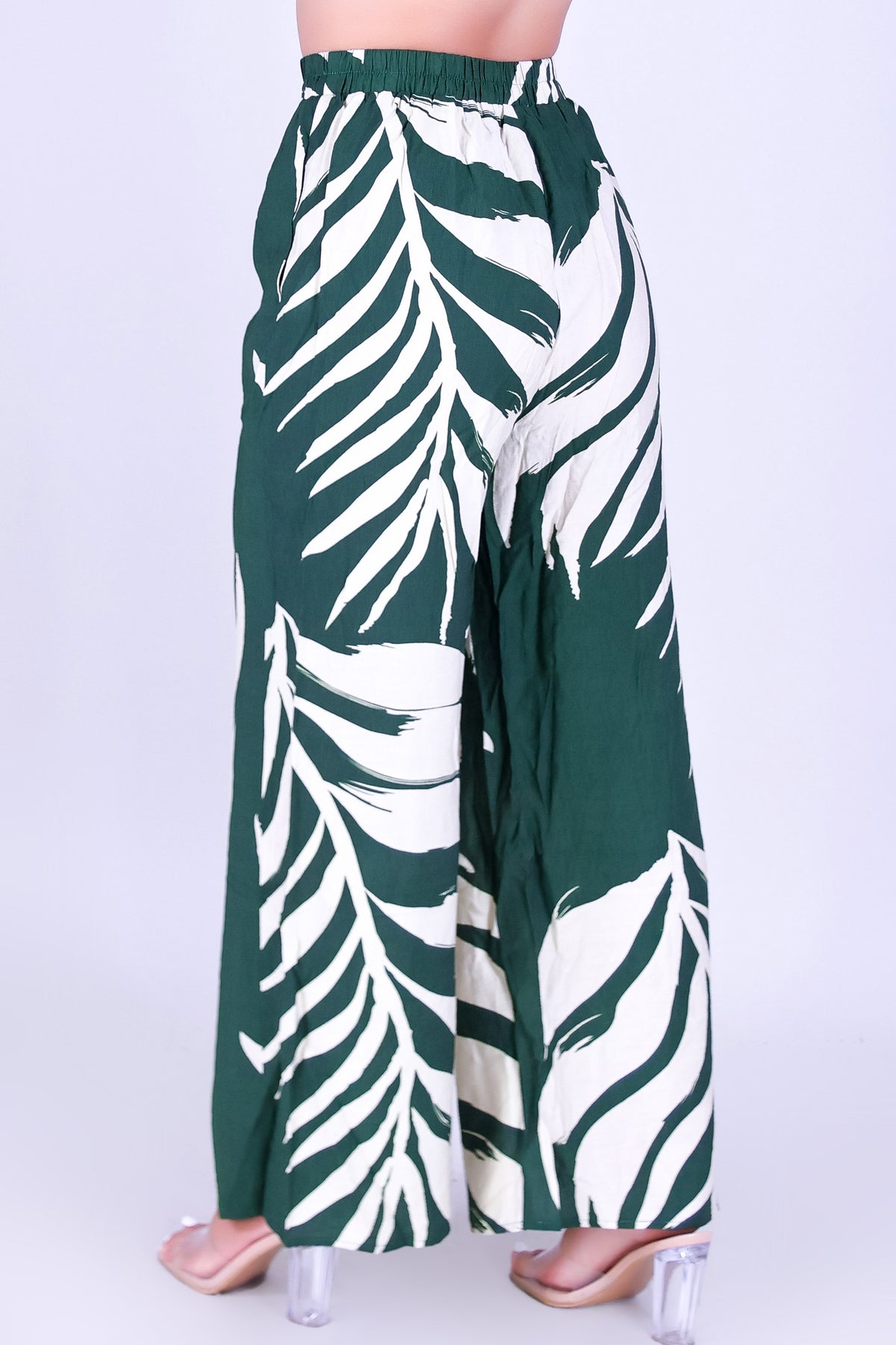 PRETTY PALM PANTS is available in color GREEN and in size SMALL, MED, LARGE.