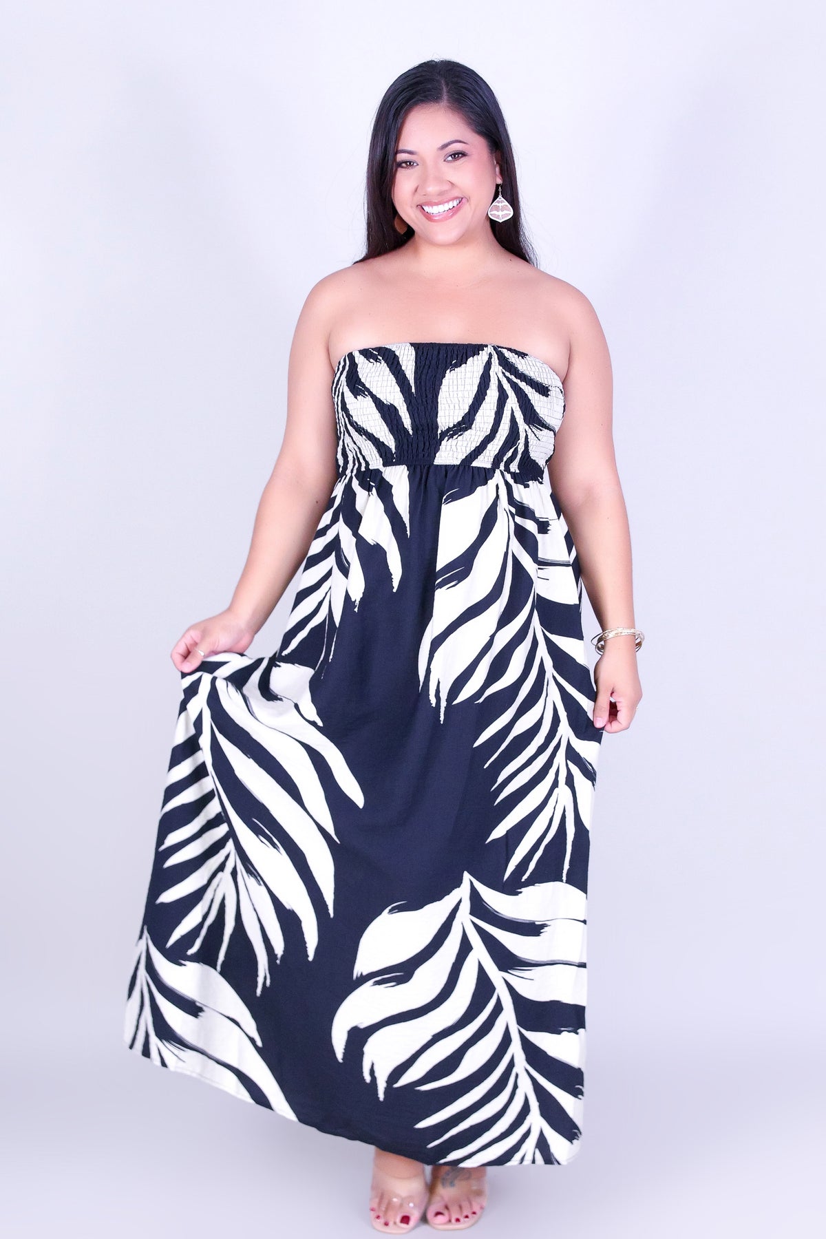 PRETTY PALM SMOCKED MAXI DRESS is available in color BLACK and in size 1X, 2X, 3X.