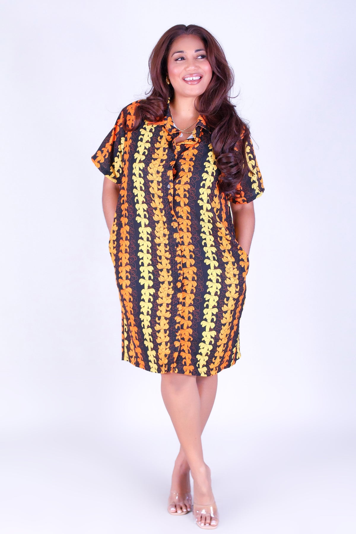 PUAKENIKENI OUTLINE BUTTON DOWN DRESS is available in color BLACK and in size 1X, 2X, 3X.