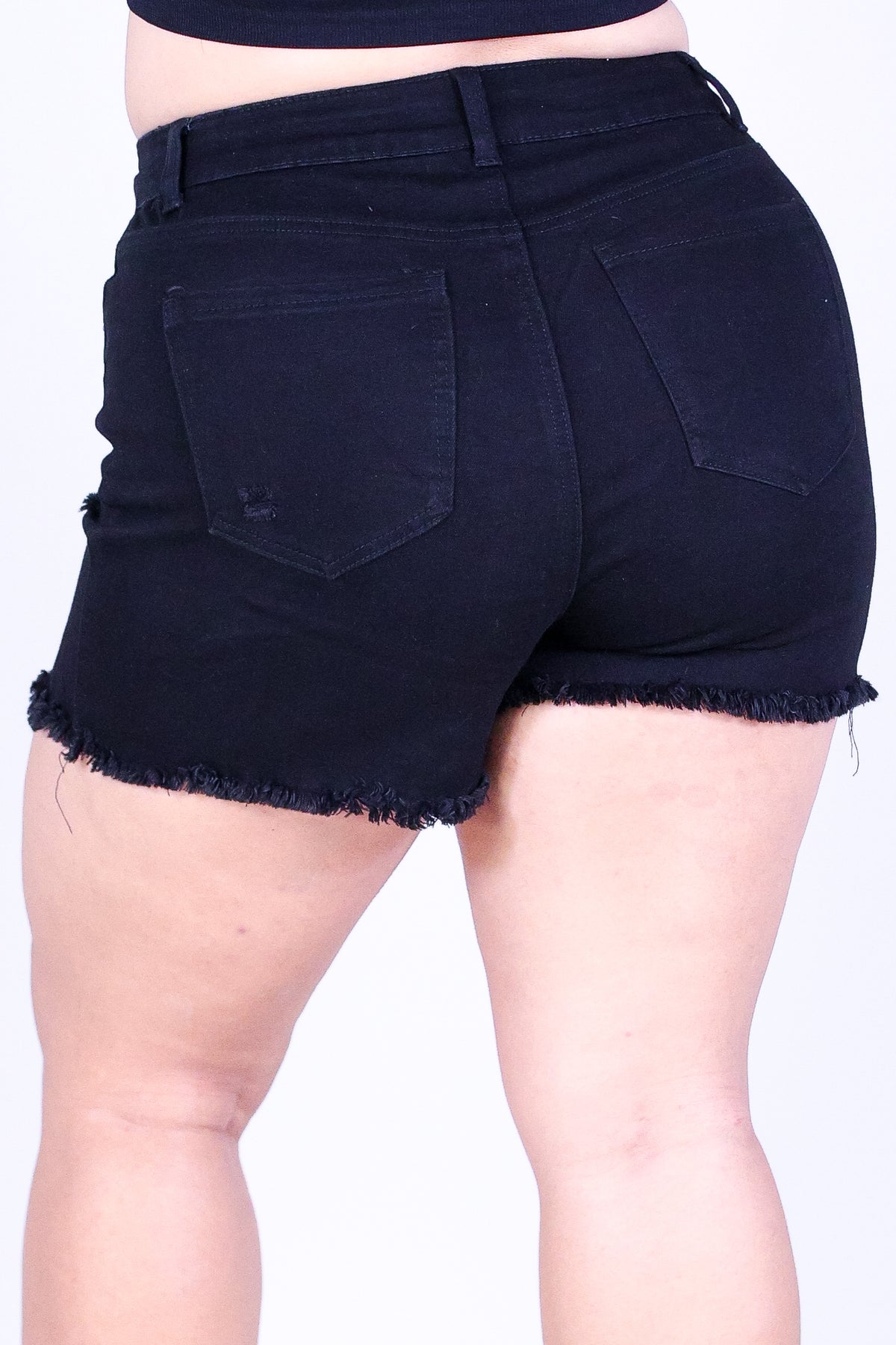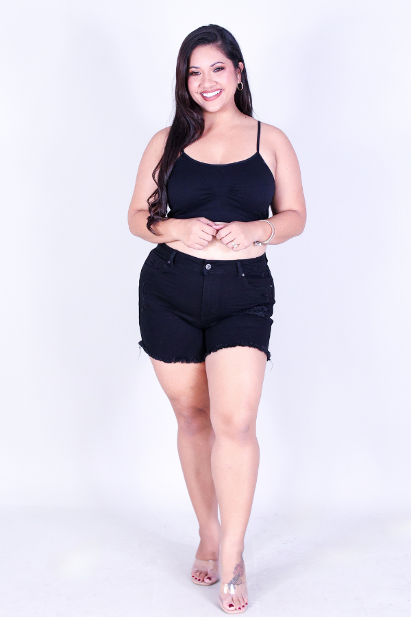 GAME CHANGER DENIM SHORTS is available in color BLACK and in size 1X, 2X, 3X.