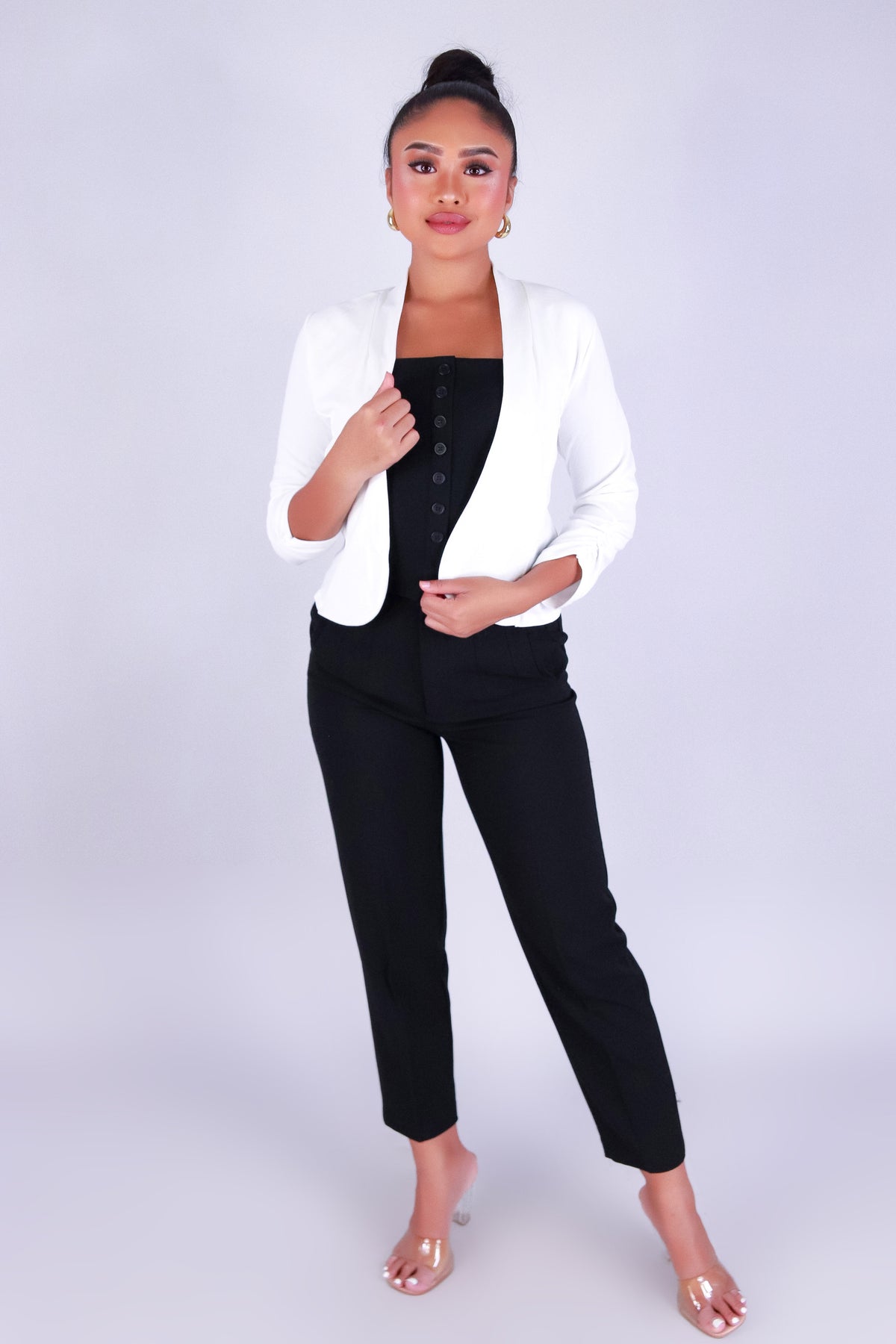 MADE SURE OF THAT BLAZER is available in color WHITE and in size SMALL, MED, LARGE.