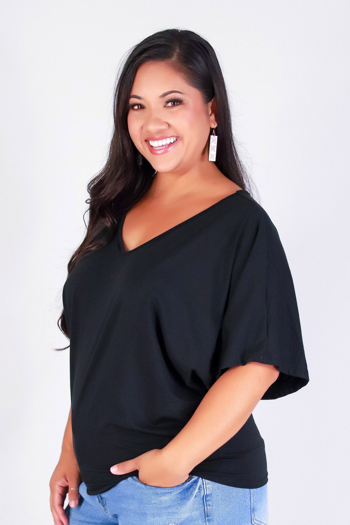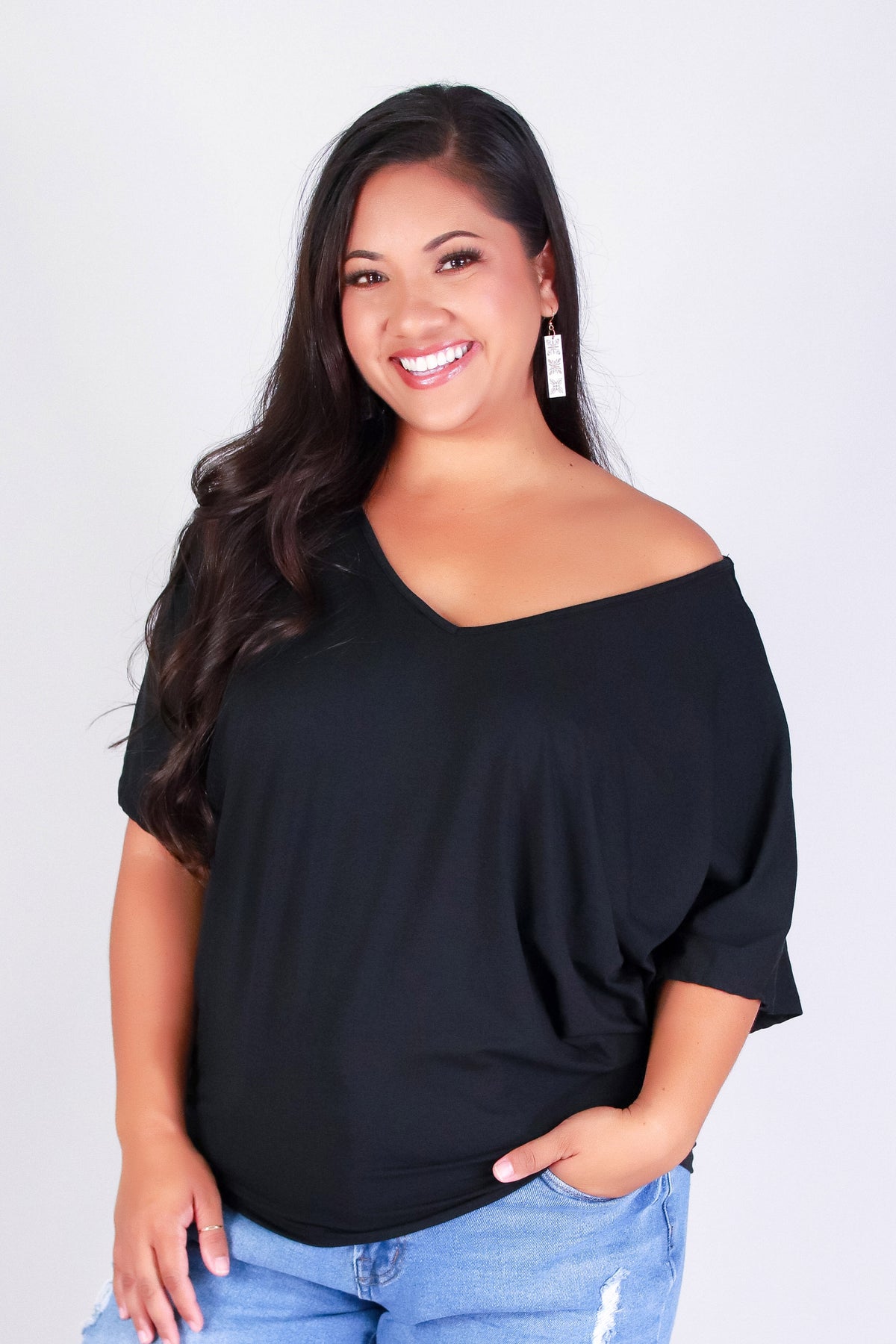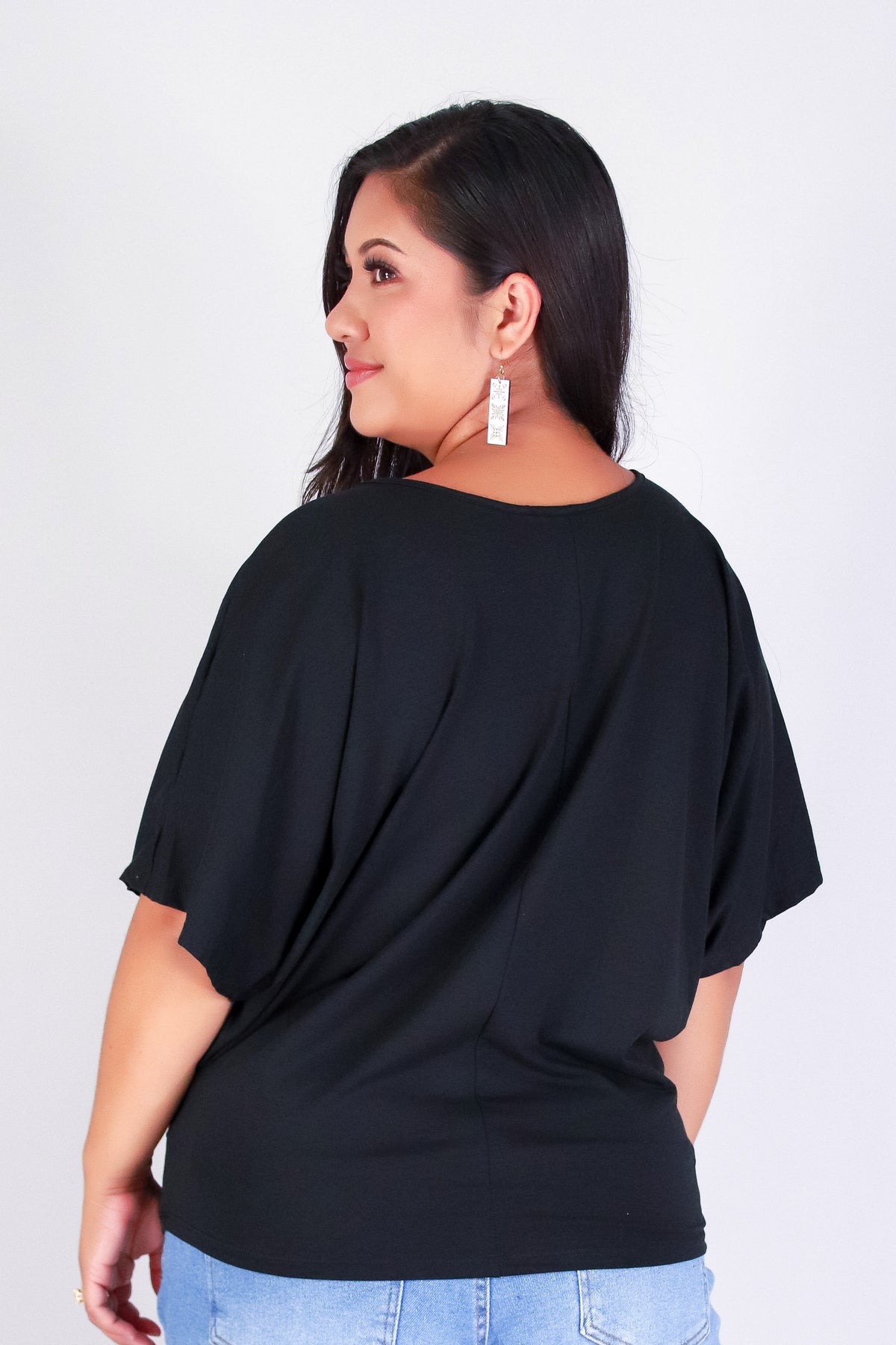 SAIL AWAY DOLMAN TOP is available in color BLACK and in size 1X, 2X, 3X.