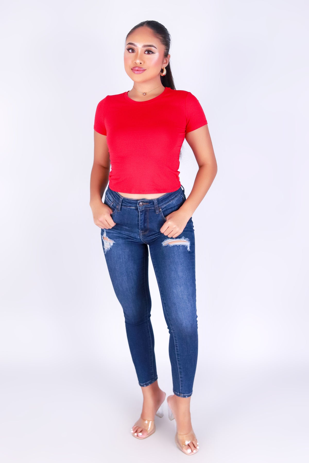 BASIC CROP TOP is available in color RED and in size SMALL, MED, LARGE.