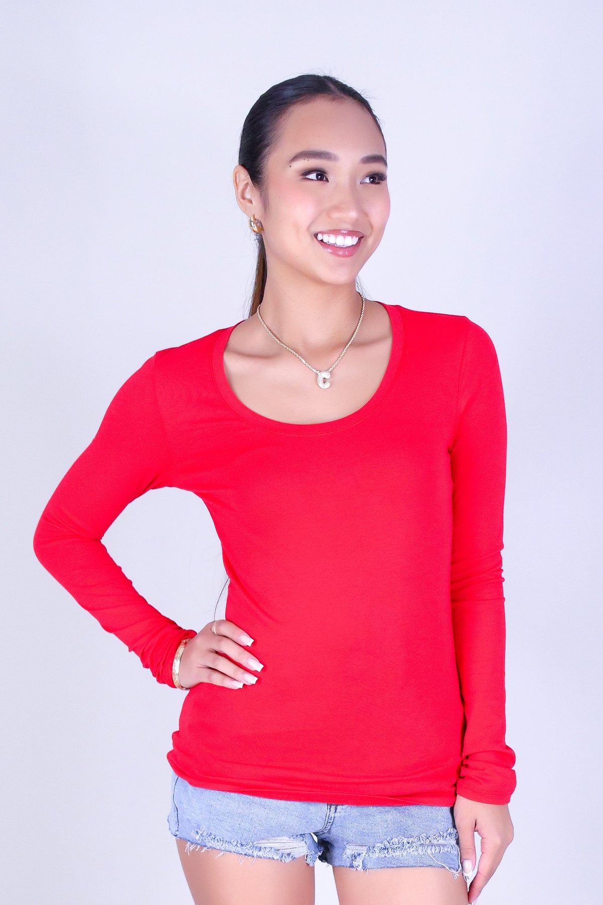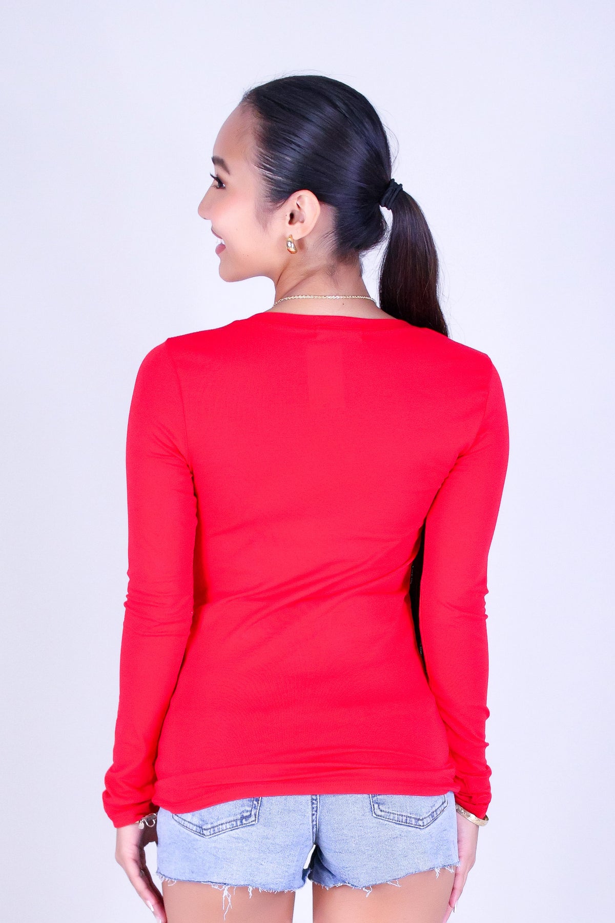 HOLD THAT THOUGHT LONG SLEEVE TOP is available in color RED and in size SMALL, MED, LARGE.