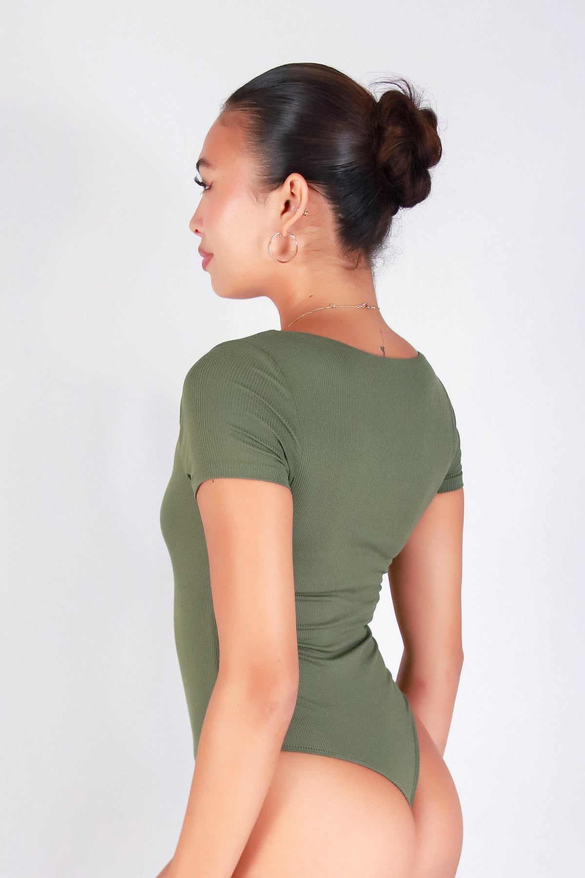 JUST MY TYPE BODYSUIT is available in color OLIVE and in size SMALL, MED, LARGE.