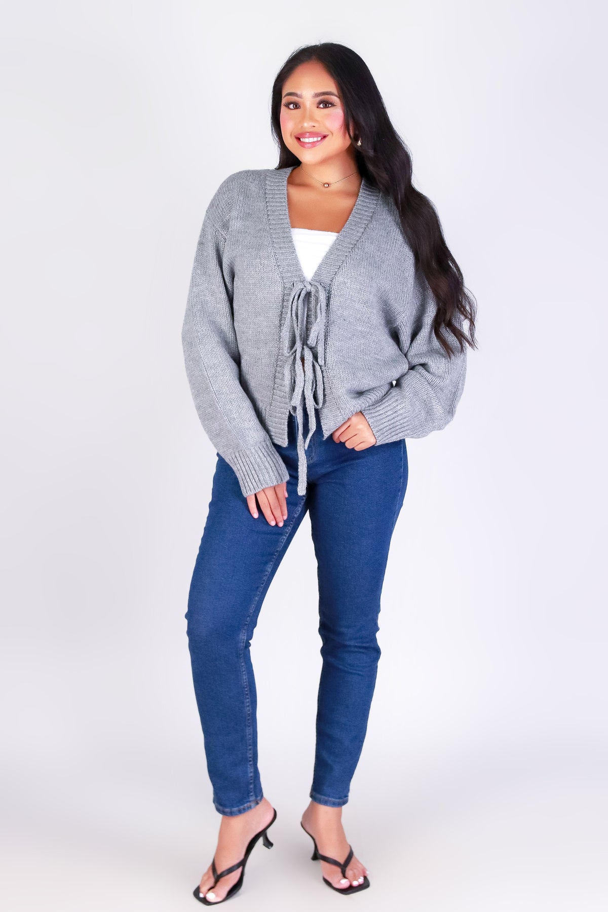 COZY KISS CARDIGAN is available in color CHARCOAL and in size SMALL, MED, LARGE.