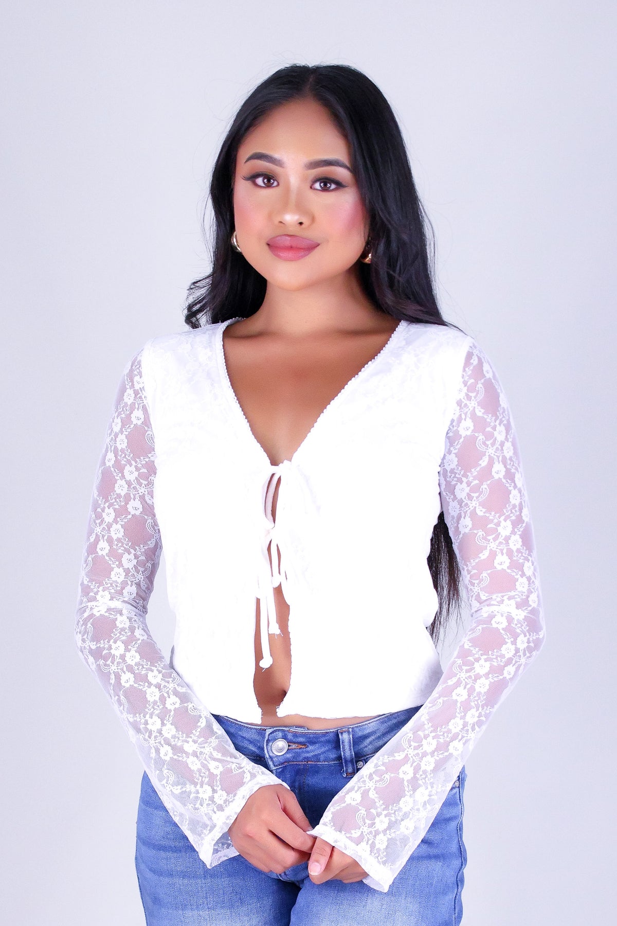 FOR THE MOMENT LACE CARDIGAN is available in color WHITE and in size SMALL, MED, LARGE.