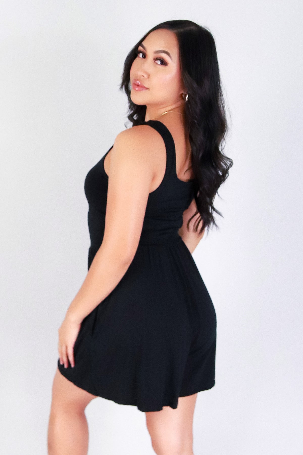 SIMPLY CHIC ROMPER is available in color BLACK and in size SMALL, MED, LARGE.