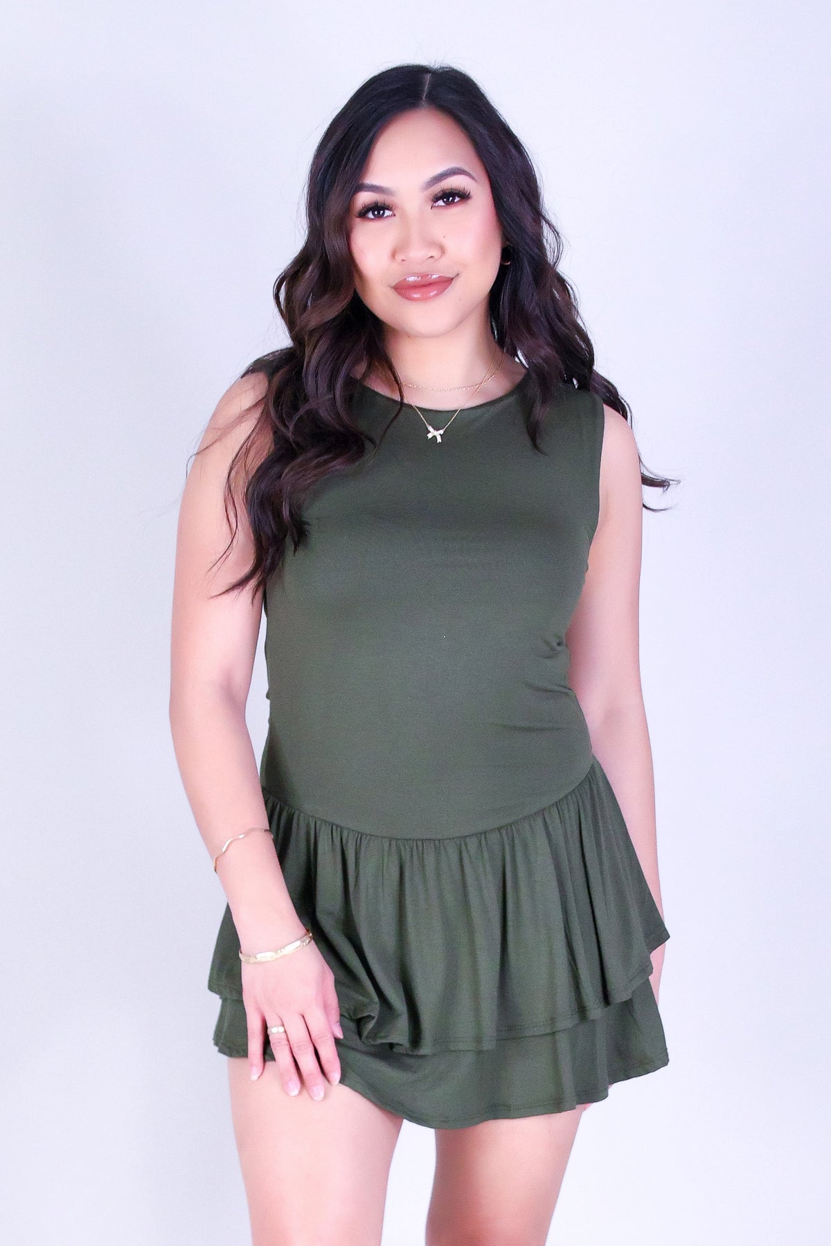 TWIRL ME RUFFLE DRESS is available in color OLIVE and in size SMALL, MED, LARGE.