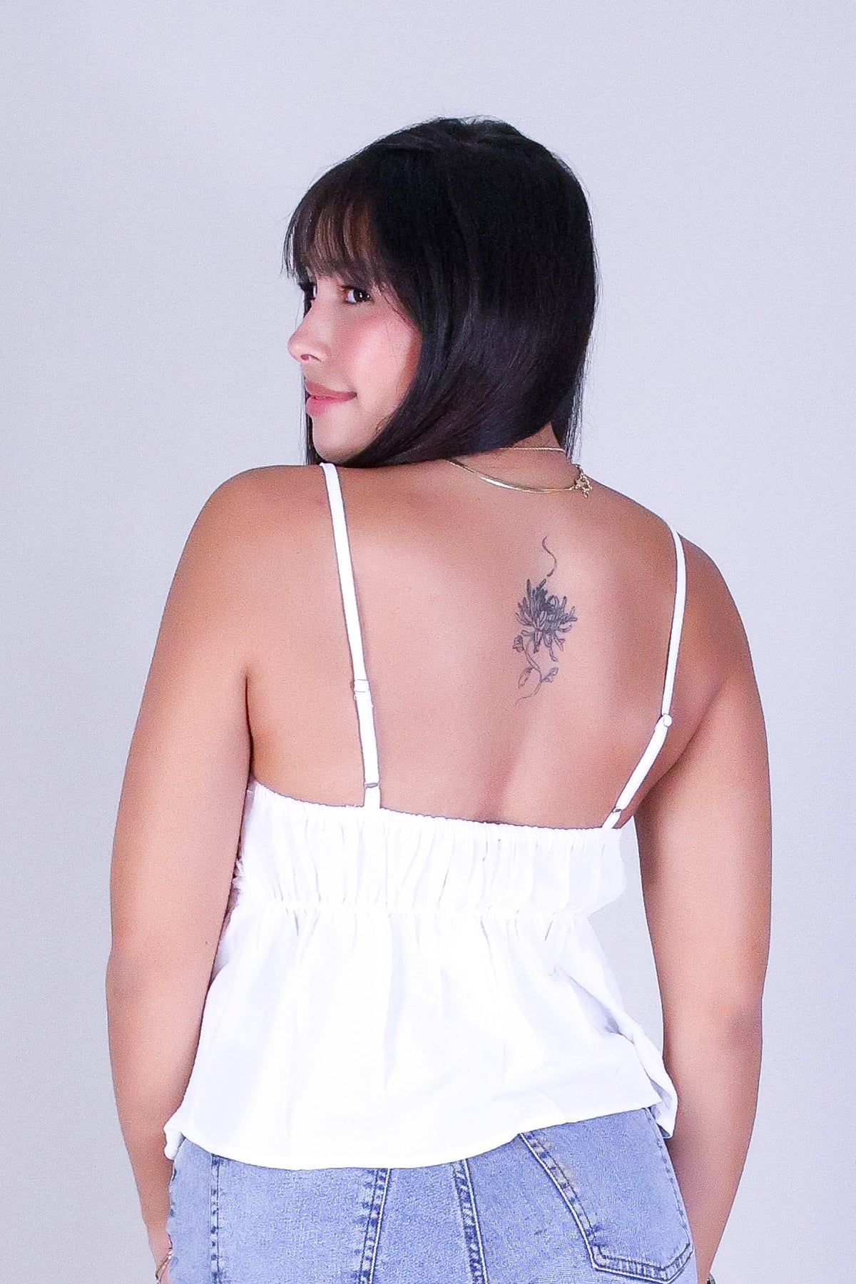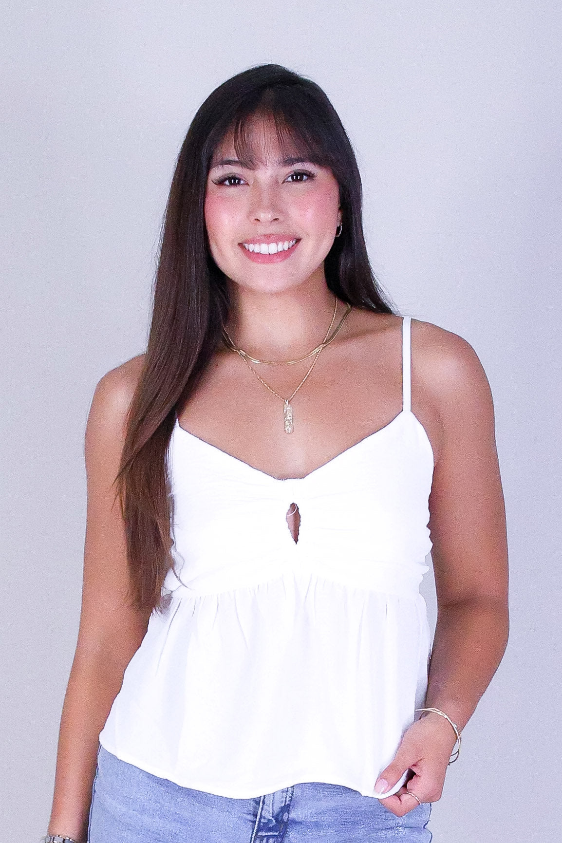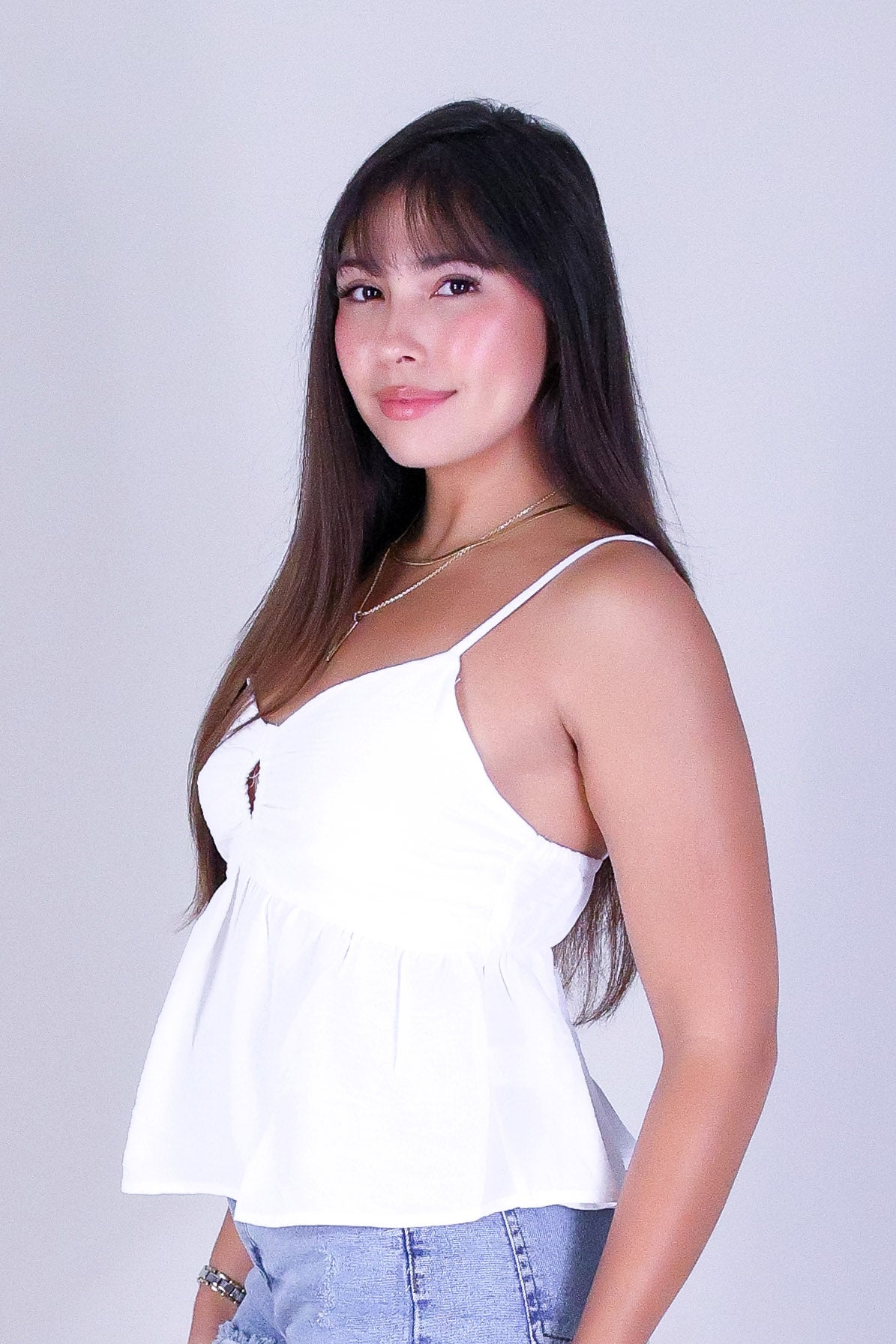 PEPPY CHIC TOP is available in color IVORY and in size SMALL, MED, LARGE.