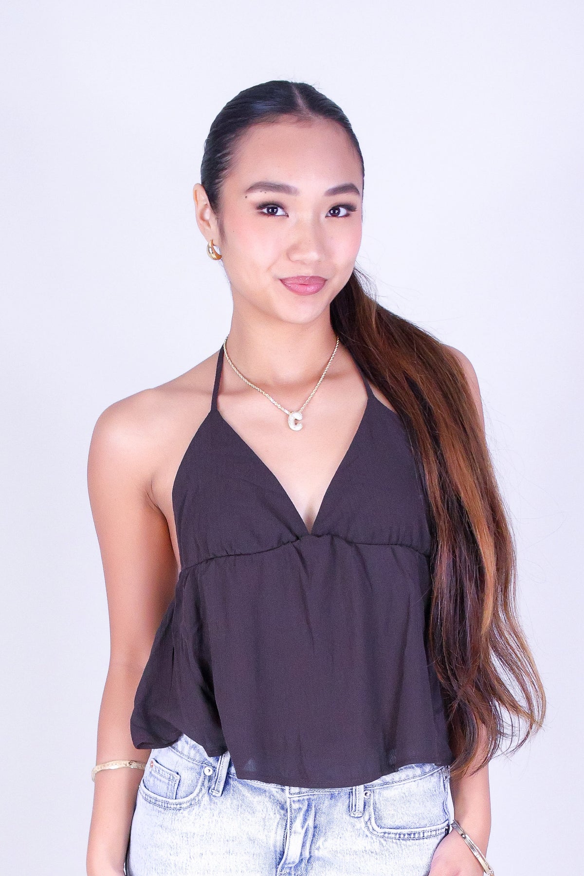 CUTIE TIE HALTER TOP is available in color BROWN and in size SMALL, MED, LARGE.