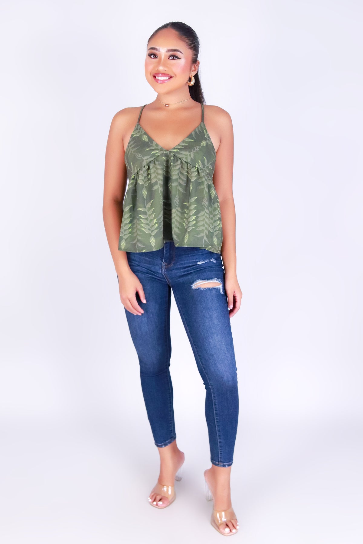 HELICONIA BABYDOLL TOP is available in color OLIVE and in size SMALL, MED, LARGE.