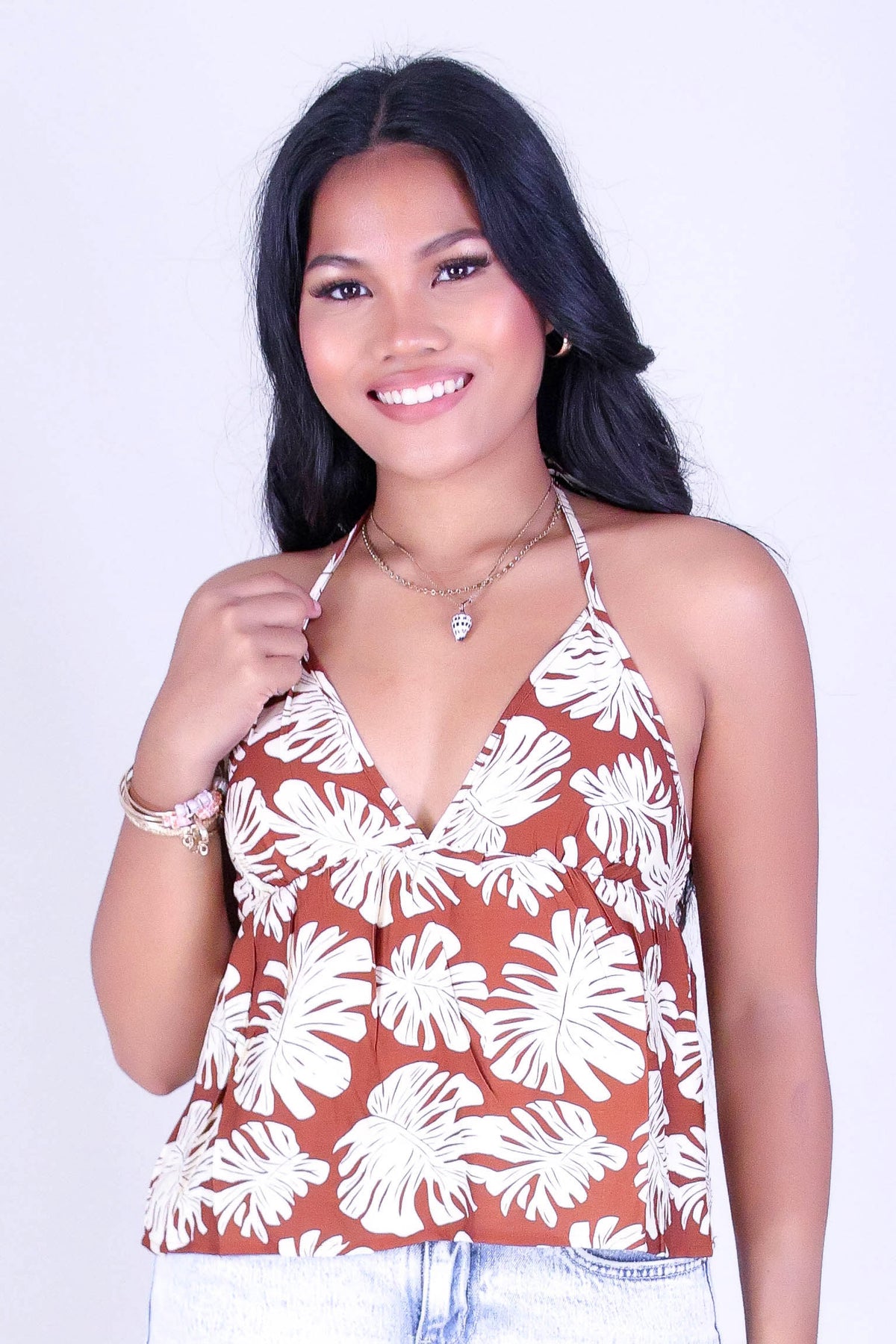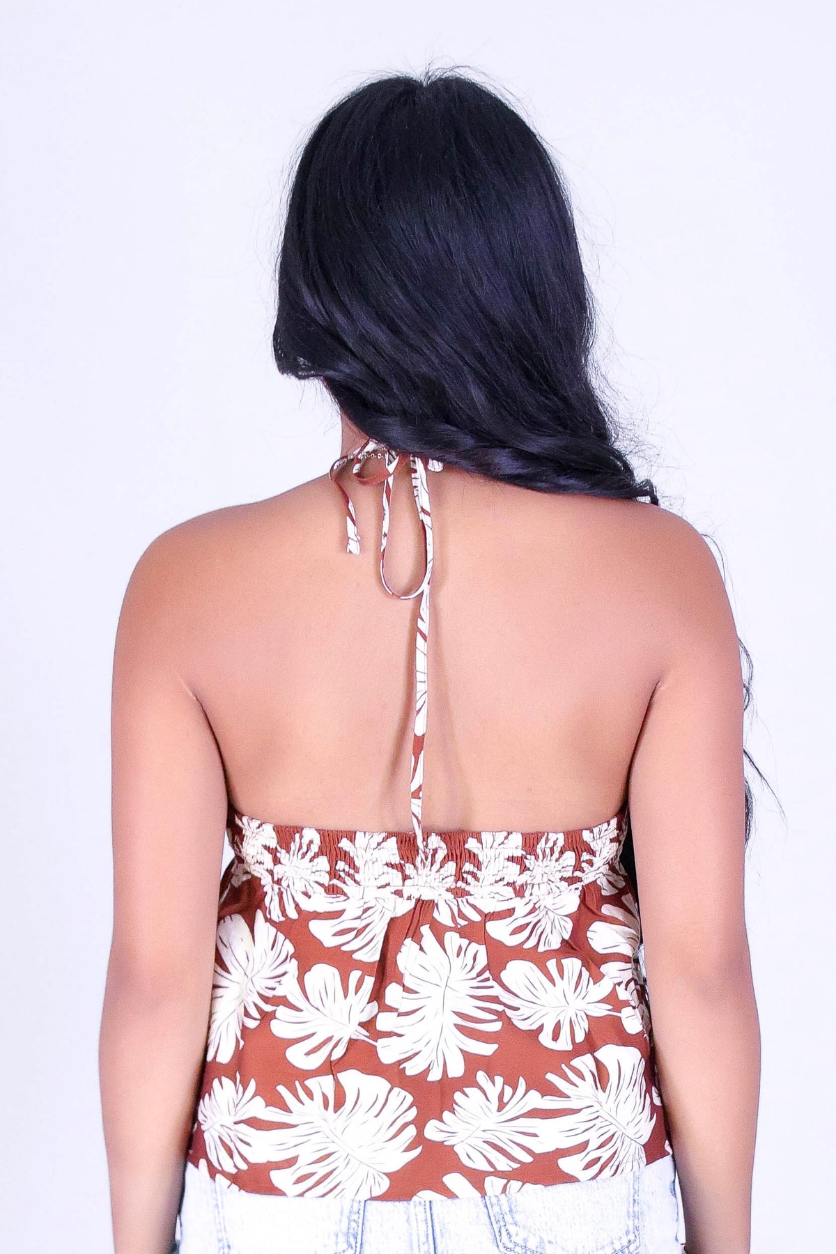 MONSTERA MOON HALTER TOP is available in color BROWN and in size SMALL, MED, LARGE.