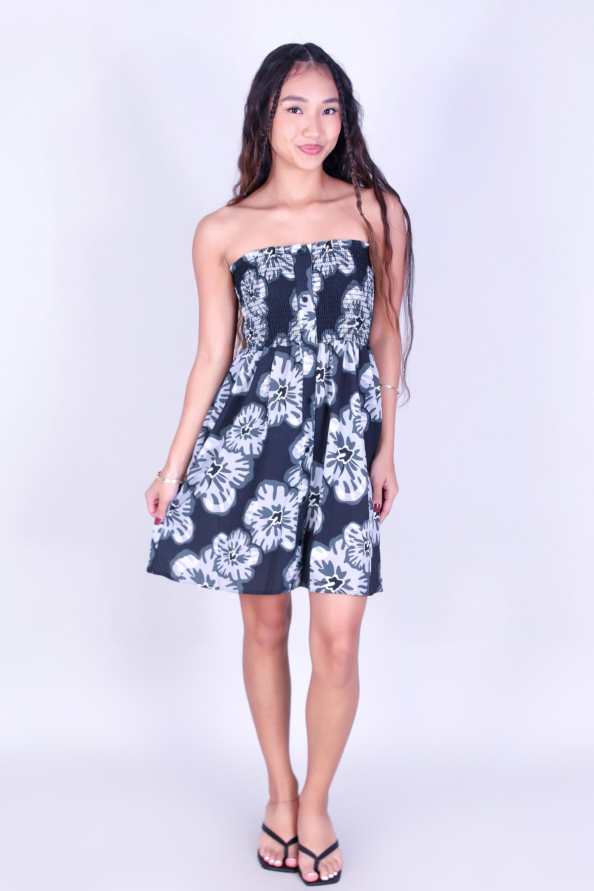 WATERCOLOR HIBISCUS SMOCKED BABYDOLL DRESS is available in color BLACK and in size SMALL, MED, LARGE.