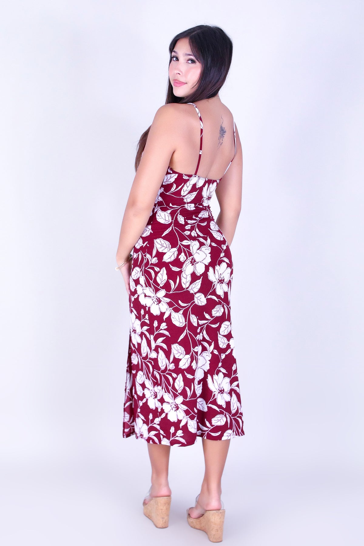 PRETTY BLOOMS DRESS is available in color BURGUNDY and in size SMALL, MED, LARGE.