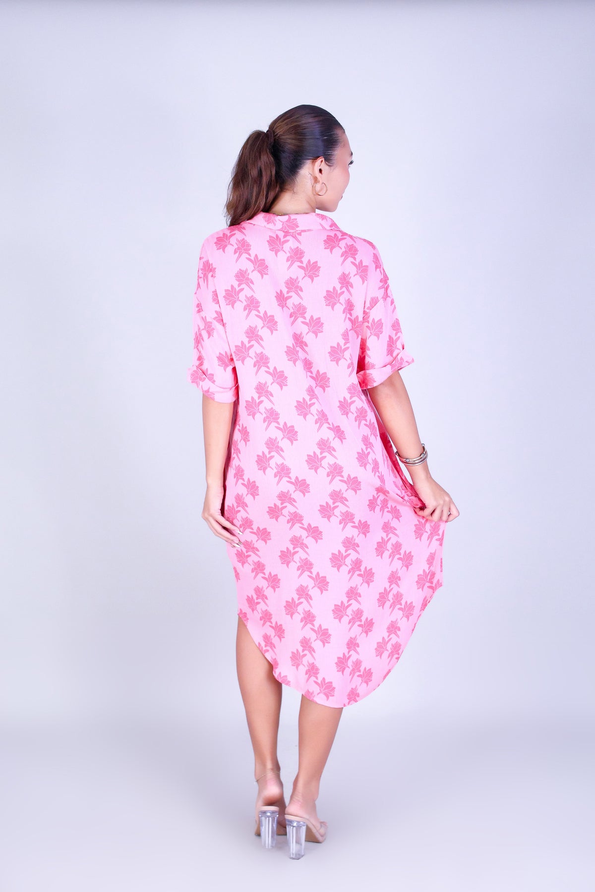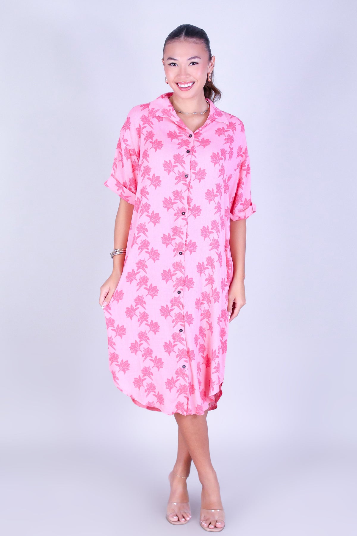 TUBEROSE BUTTON DOWN DRESS is available in color PINK and in size SMALL, MED, LARGE, XL.