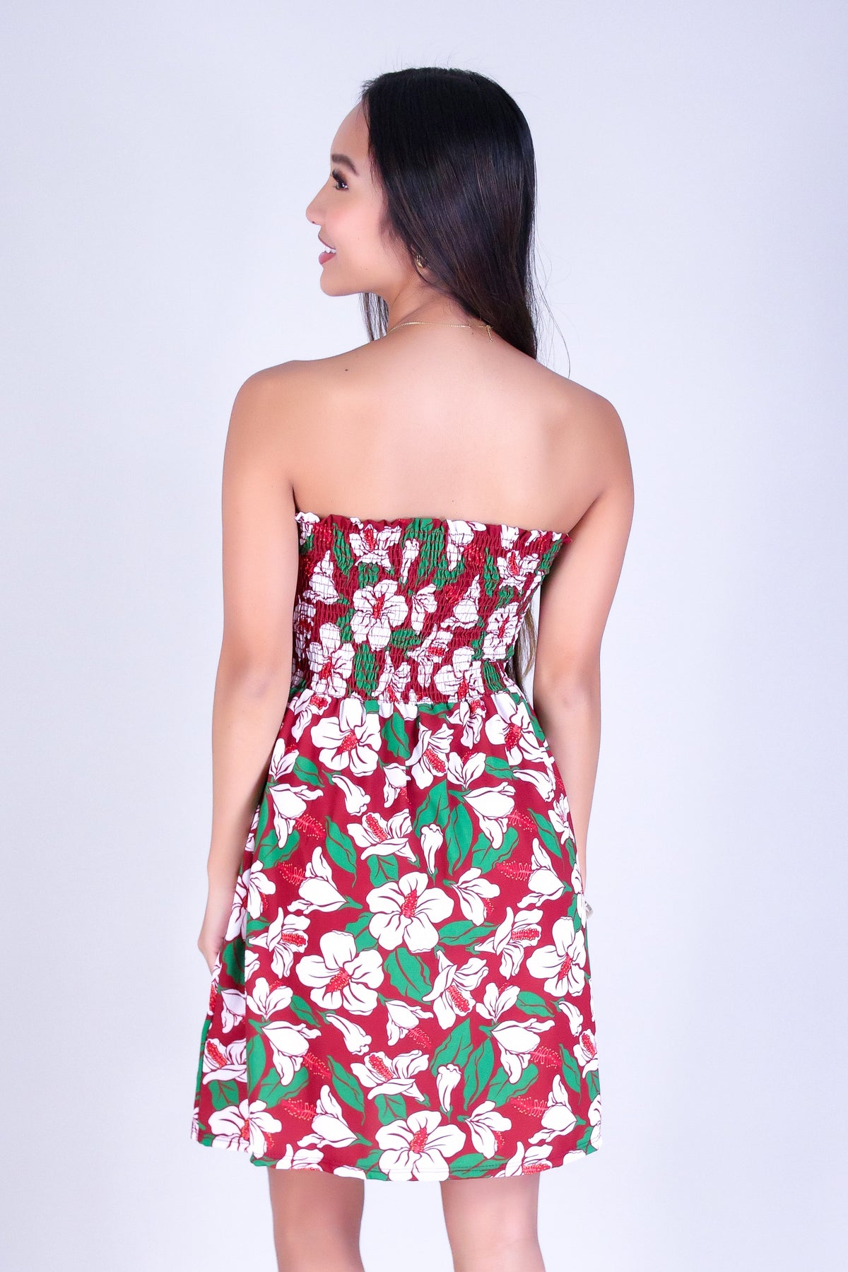 KOKIO KEOKEO SMOCKED BABYDOLL DRESS is available in color BURGUNDY and in size SMALL, MED, LARGE.
