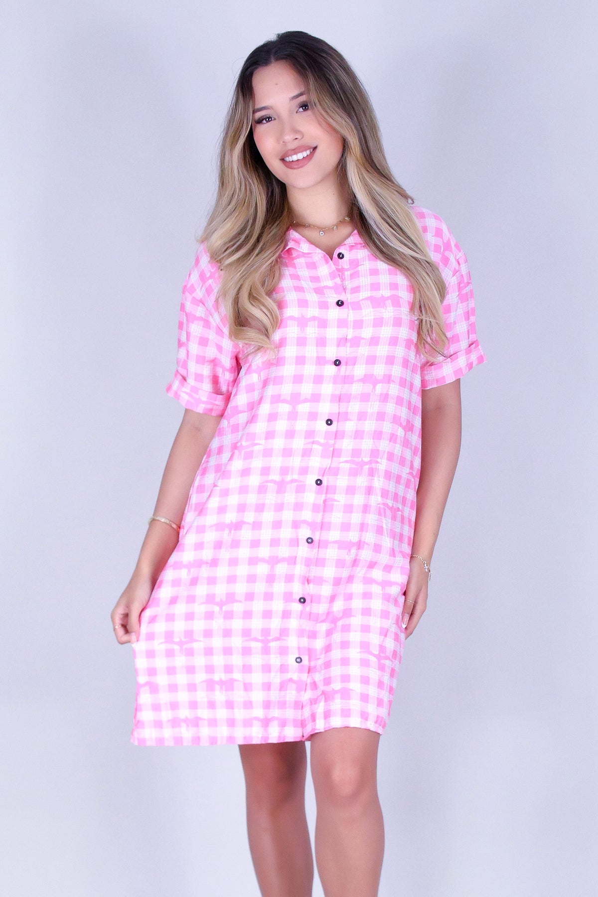 IWA PALAKA BUTTON DOWN DRESS is available in color PINK and in size SMALL, MED, LARGE, XL.