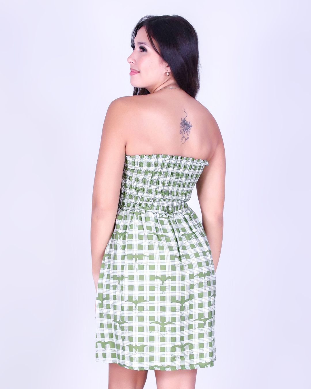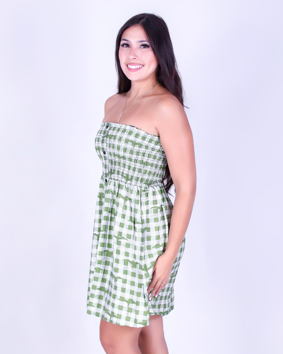 IWA PALAKA SMOCKED BABYDOLL DRESS is available in color OLIVE and in size SMALL, MED, LARGE.