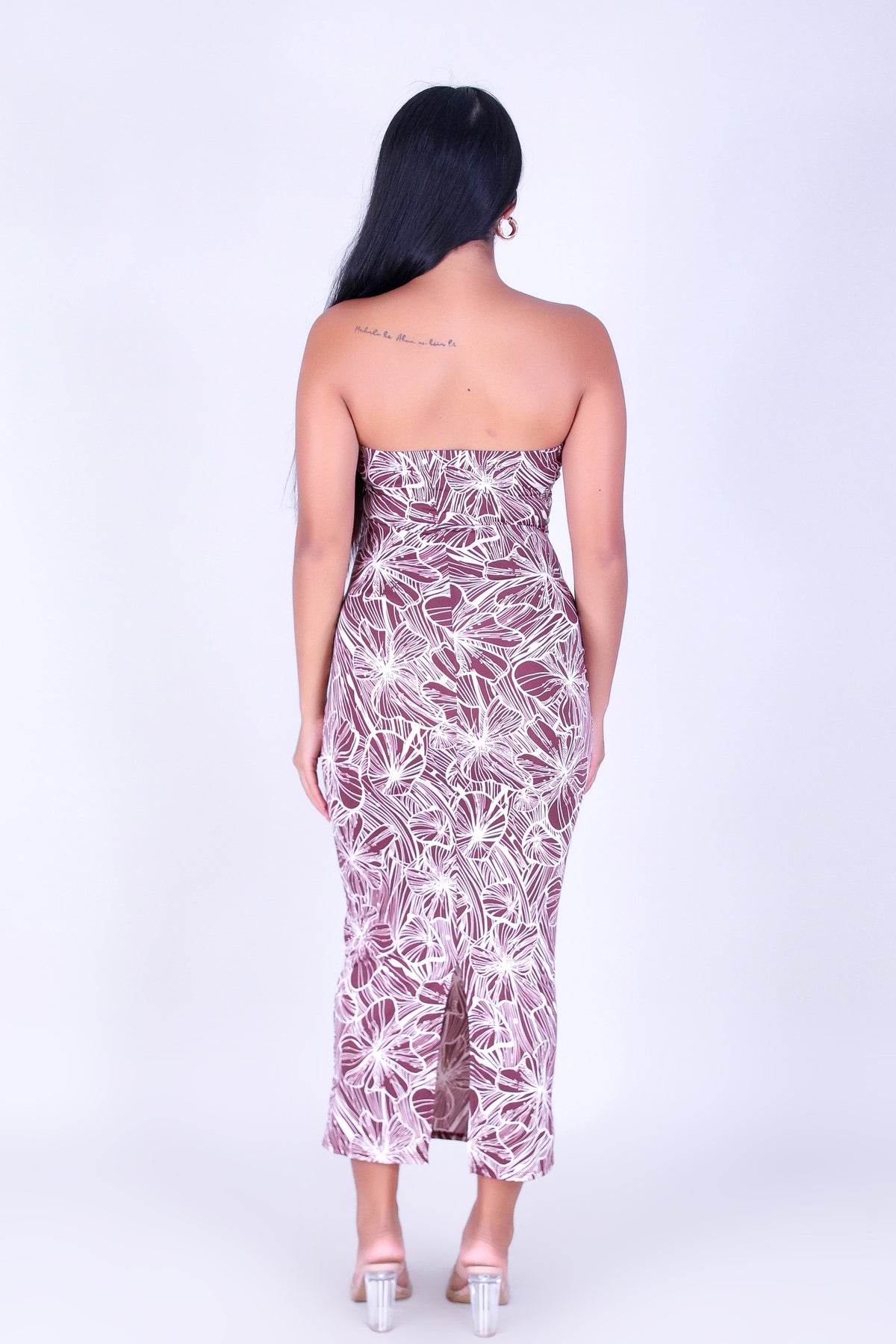 BLOOM WHISPER TUBE DRESS is available in color BROWN and in size SMALL, MED, LARGE.