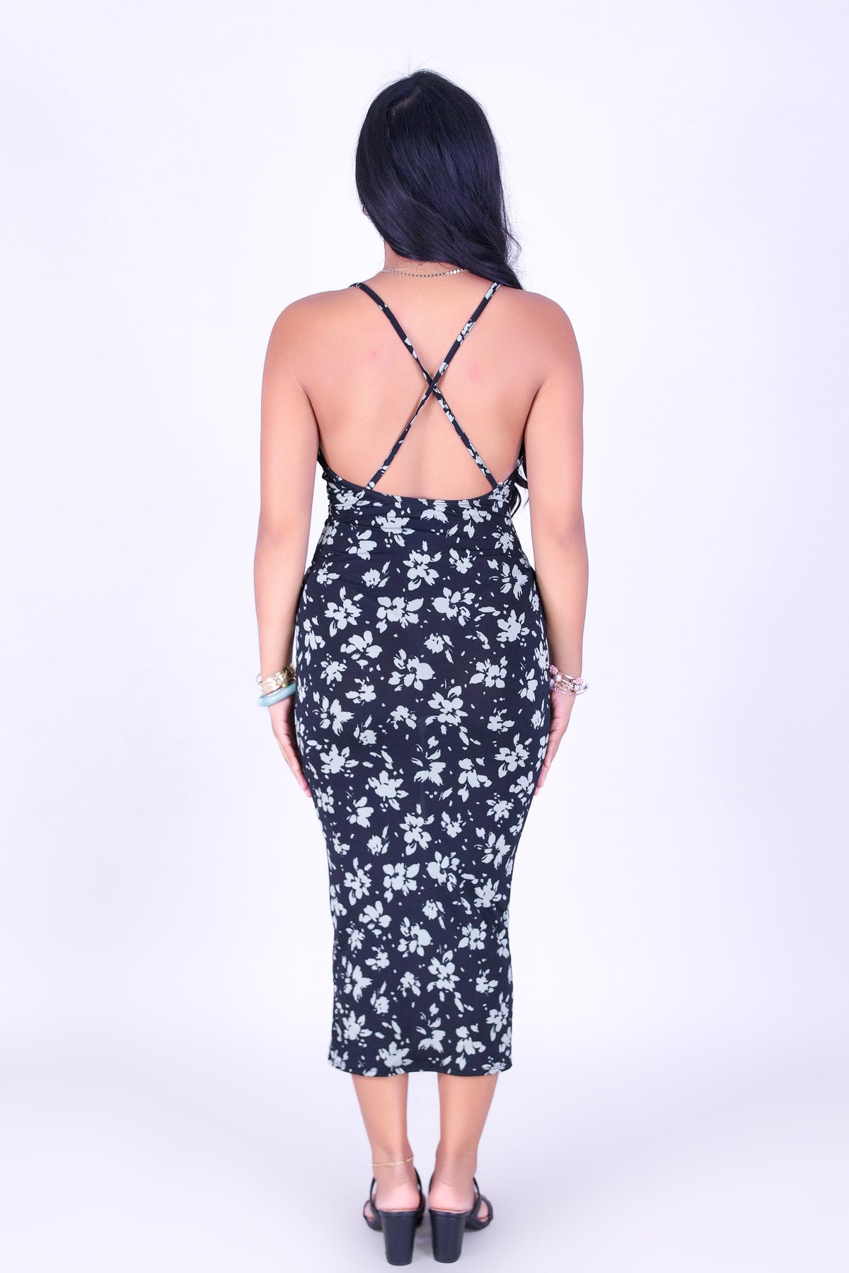 BLUSH GARDEN MIDI DRESS is available in color BLACK and in size SMALL, MED, LARGE.