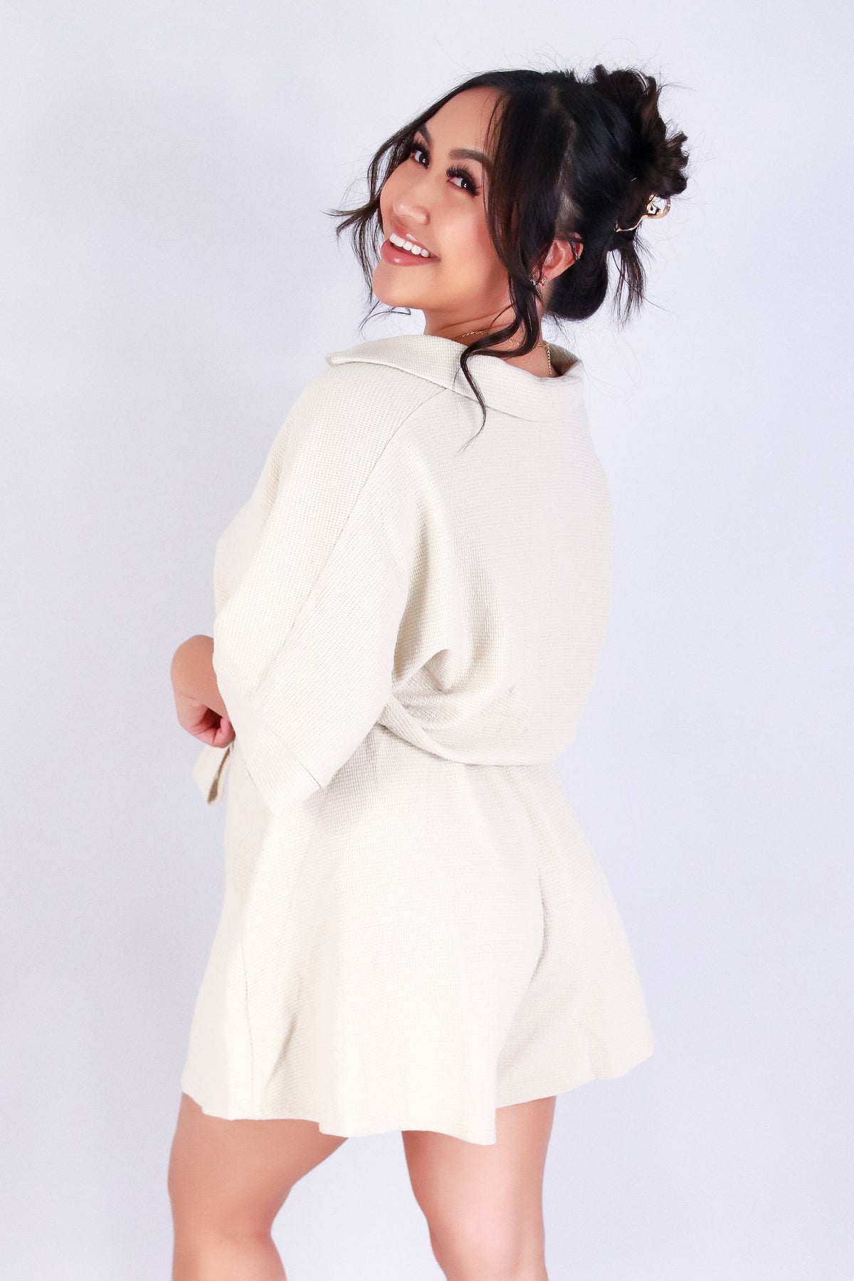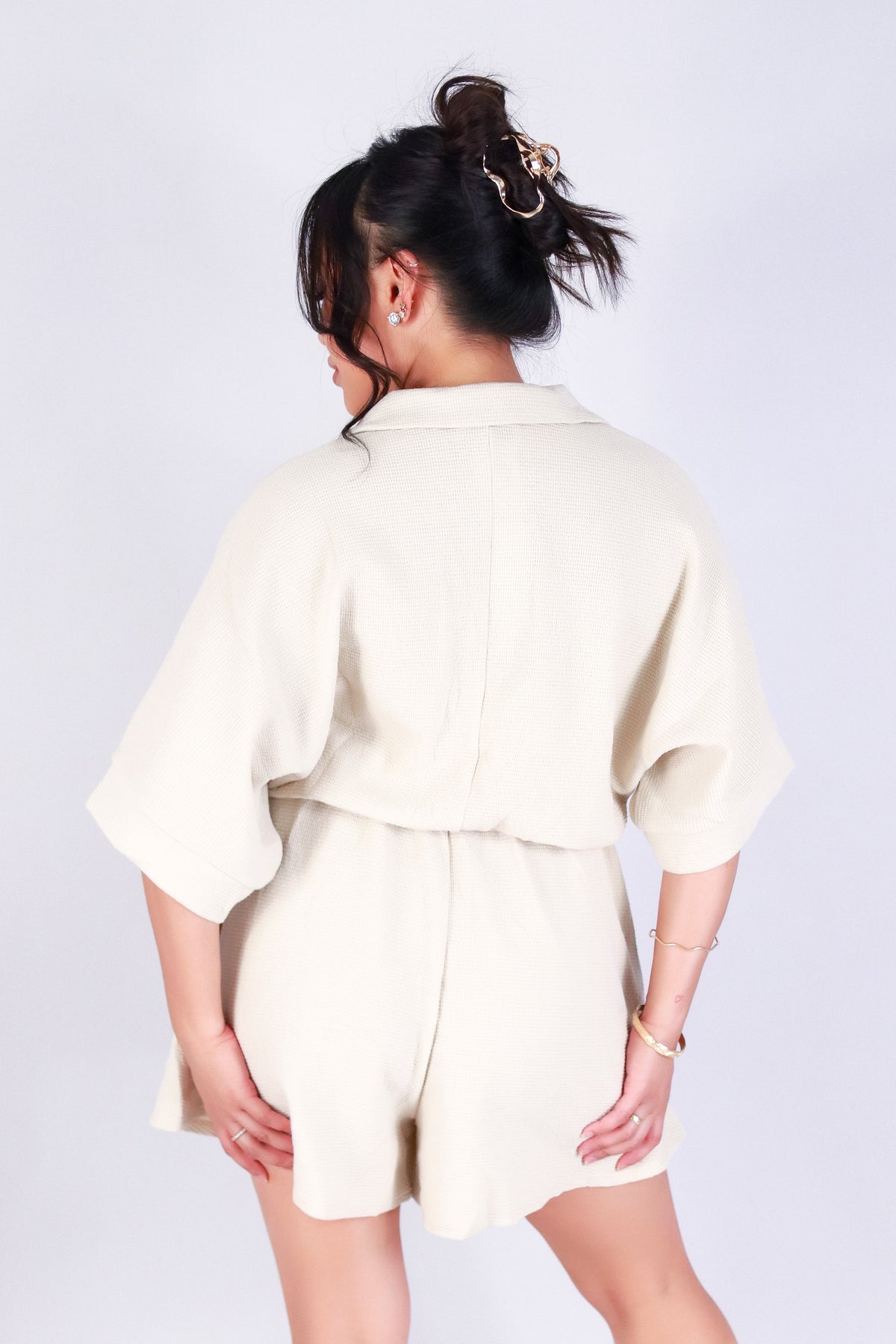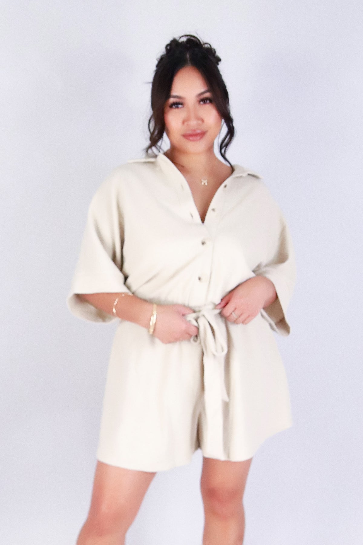NUDE & NEUTRAL ROMPER is available in color OATMEAL and in size SMALL, MED, LARGE.