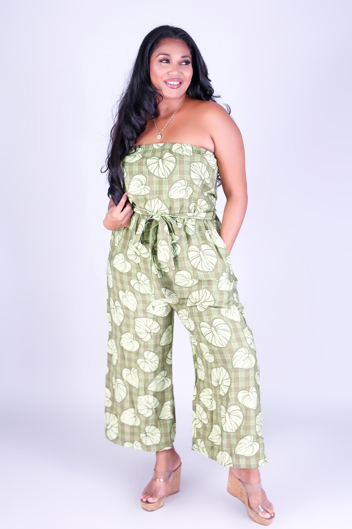 ANTHURIUM PALAKA TUBE JUMPSUIT is available in color OLIVE and in size 1X, 2X, 3X.