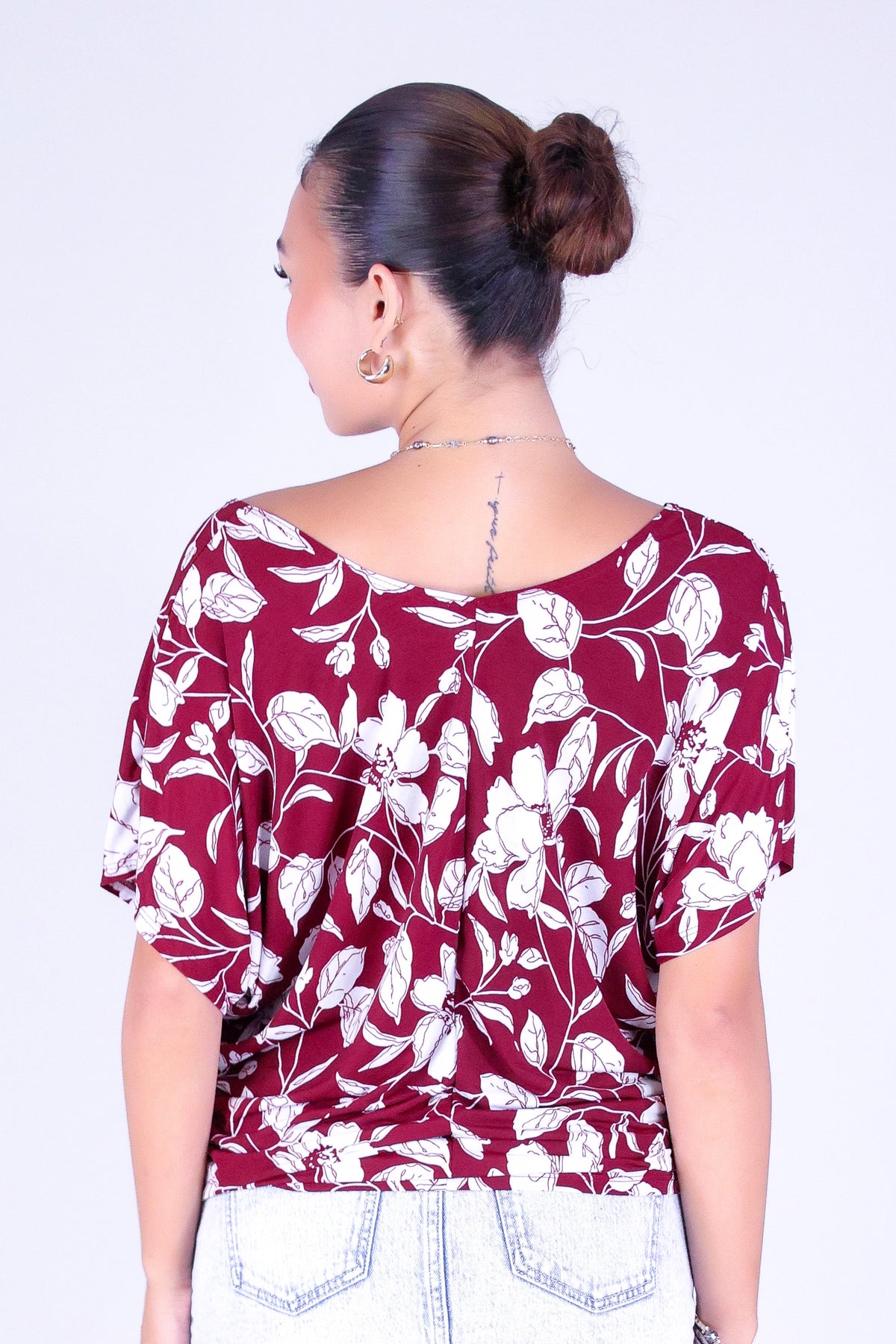 PRETTY BLOOMS DOLMAN TOP is available in color BURGUNDY and in size SMALL, MED, LARGE.