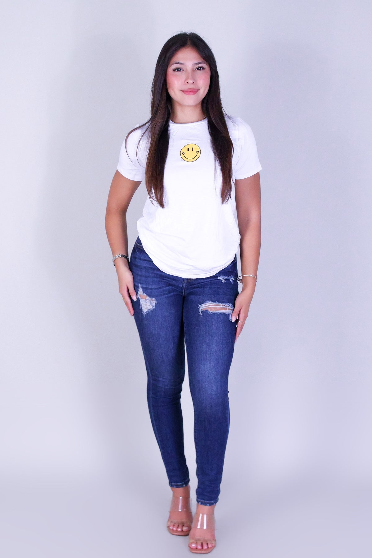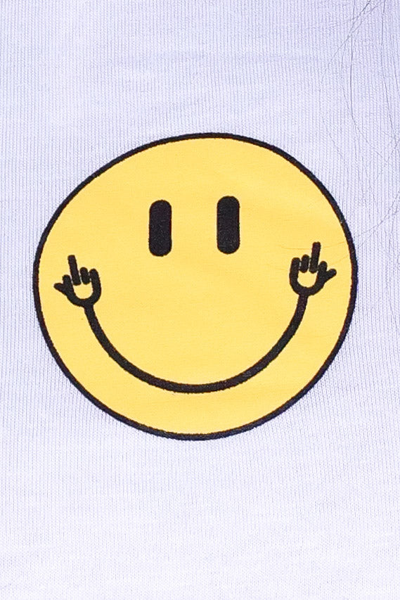SMILEY FACE TEE is available in color WHITE and in size SMALL, MED, LARGE, XL.