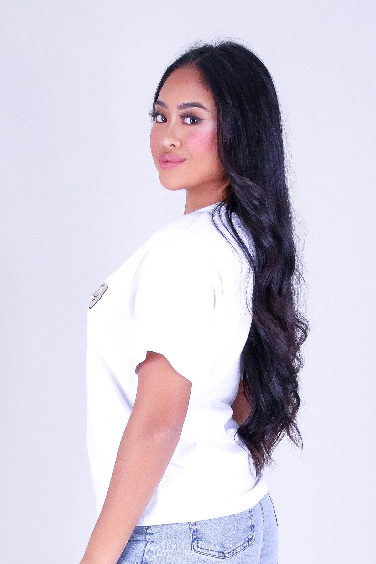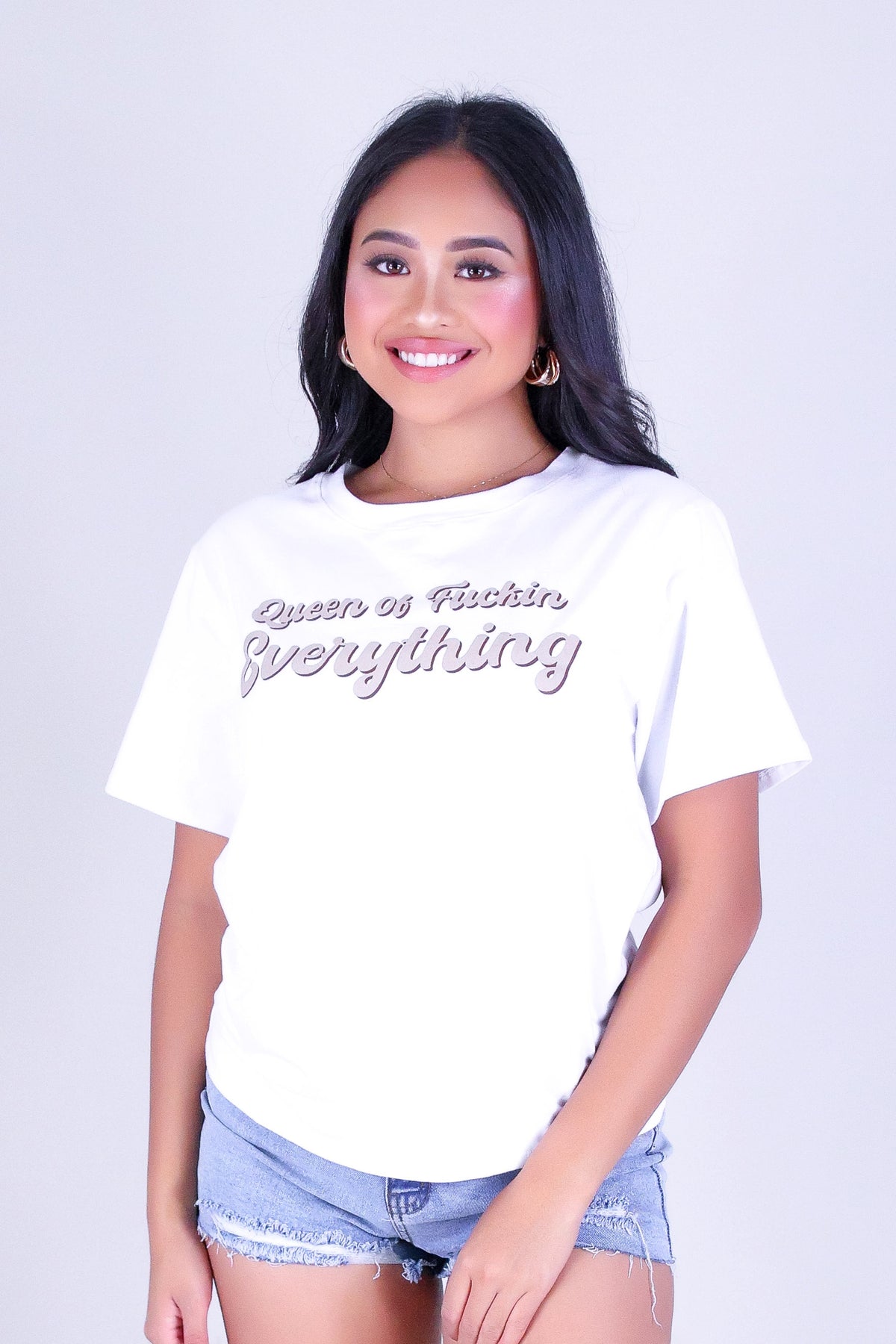 QUEEN OF EVERYTHING TEE is available in color WHITE and in size SMALL, MED, LARGE.