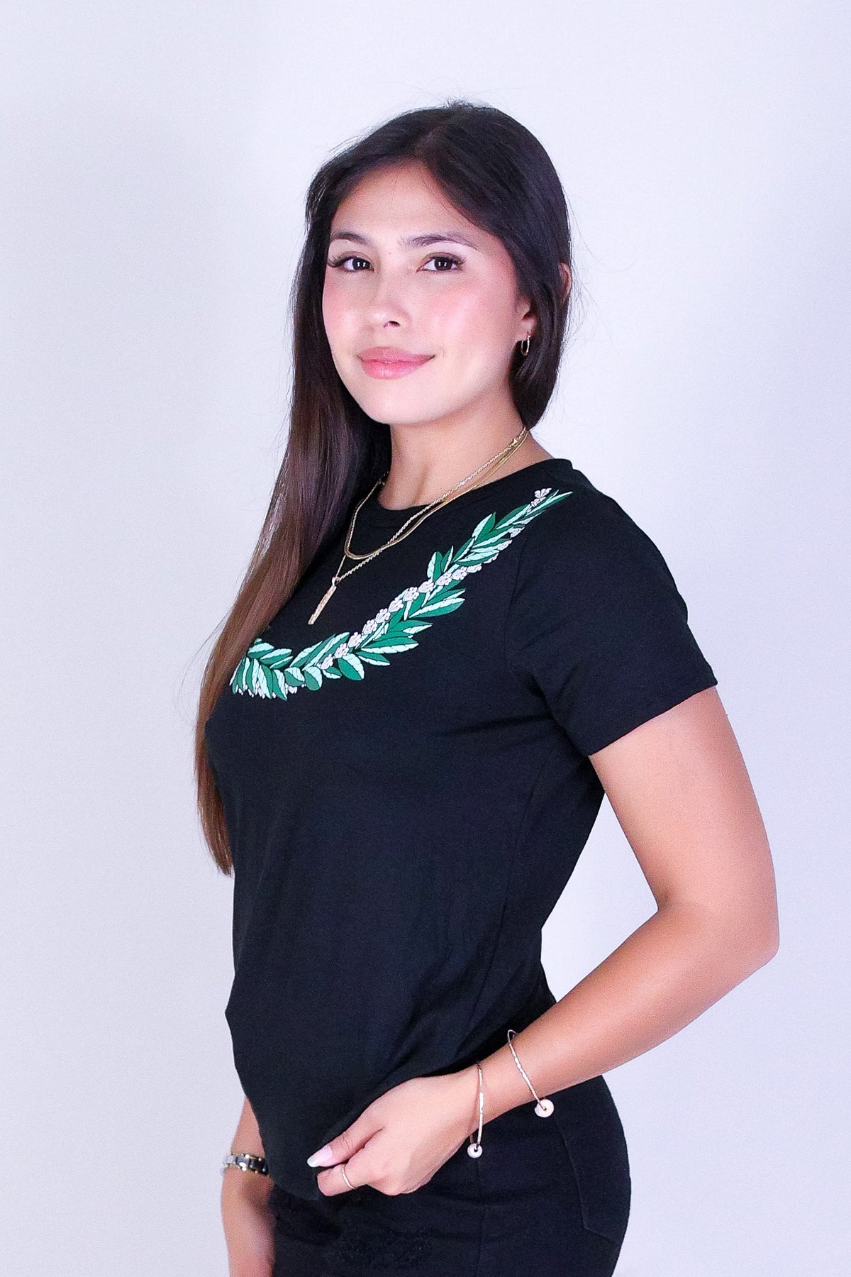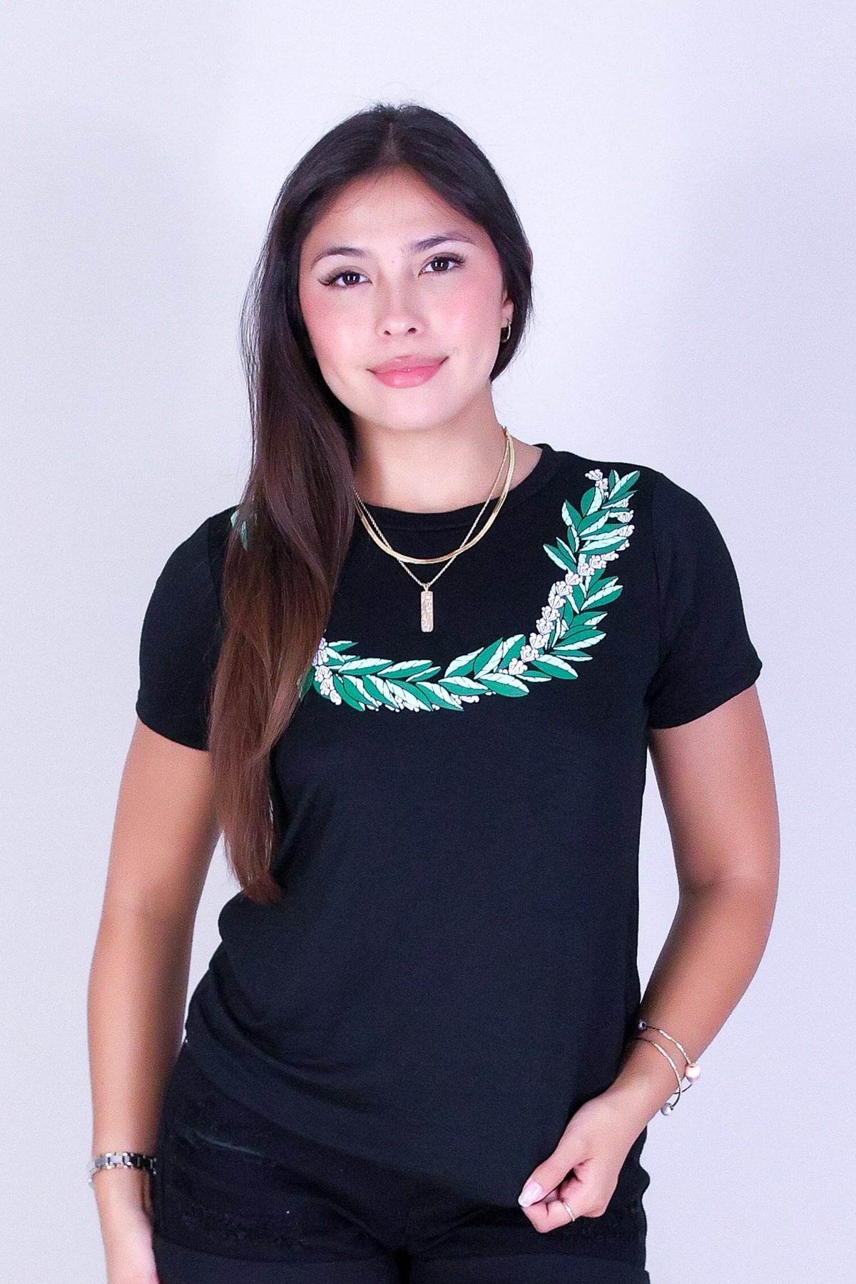 MAILE CROWN FLOWER TEE is available in color BLACK and in size SMALL, MED, LARGE, XL.