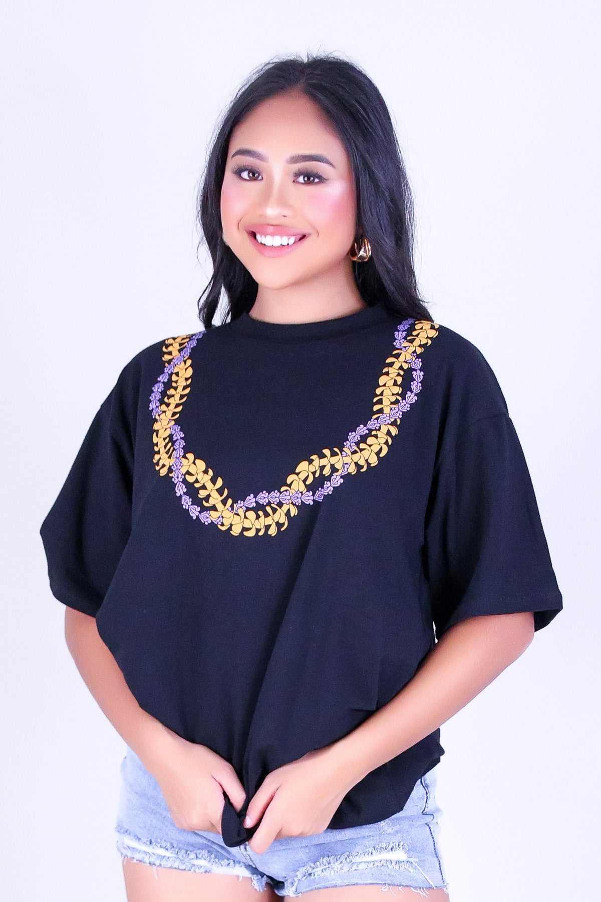 PUAKENIKENI CROWN FLOWER OVERSIZED TEE is available in color BLACK and in size SMALL, MED, LARGE.