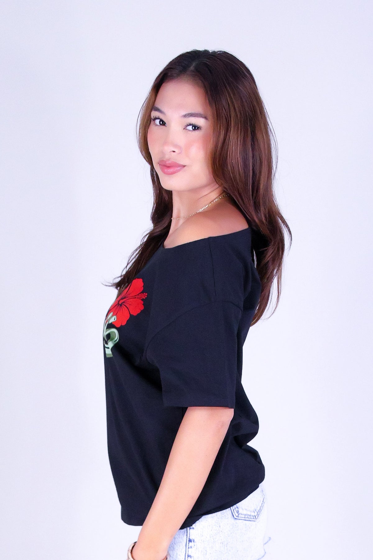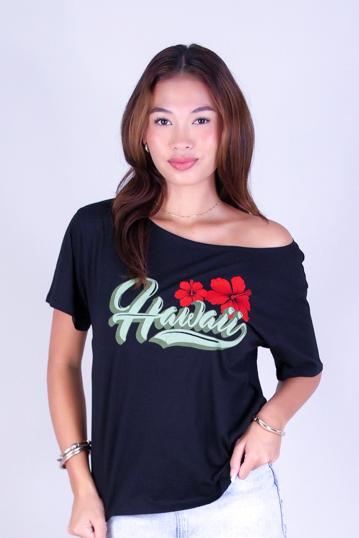 HAWAII HIBISCUS OFF SHOULDER TEE is available in color BLACK and in size XS, SMALL, MED, LARGE, XL.