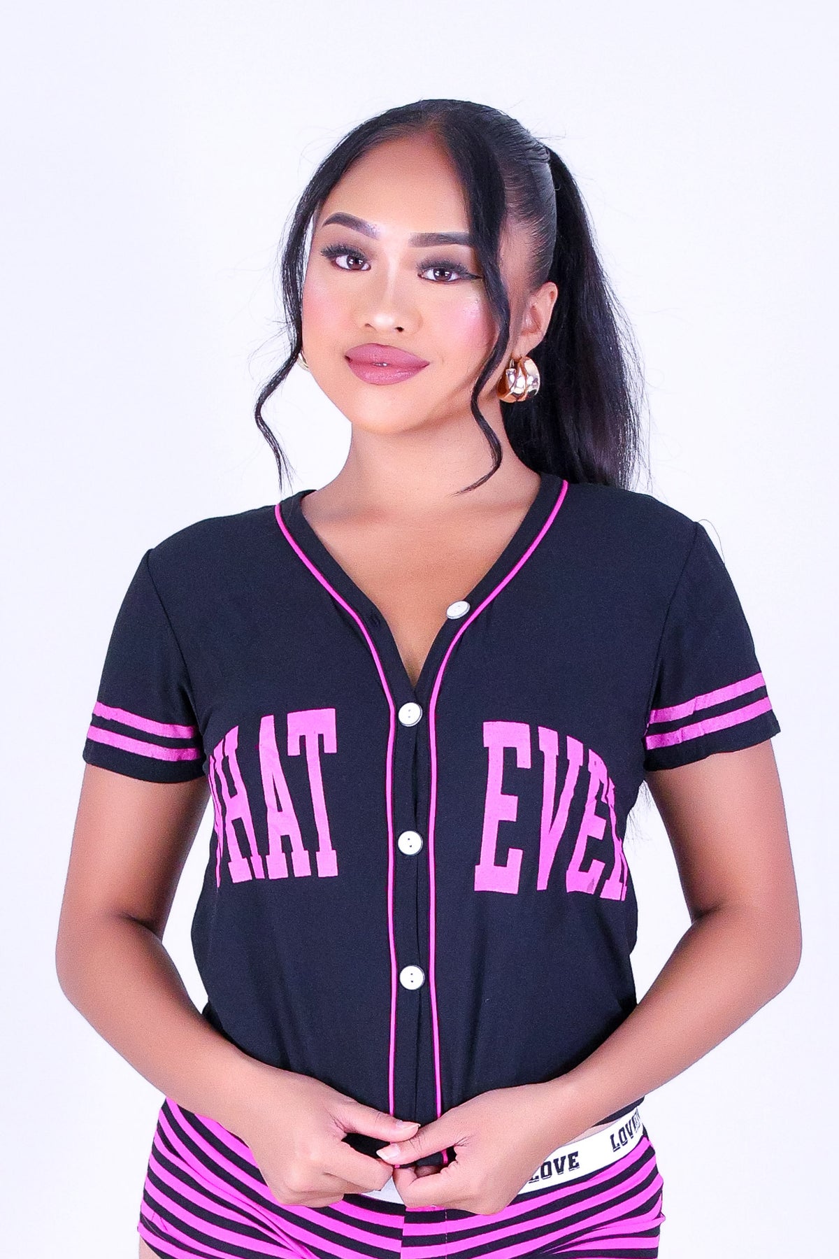 WHATEVER BASEBALL JERSEY PAJAMA SET (2PC) is available in color BLACK and in size SMALL, MED, LARGE, XL.
