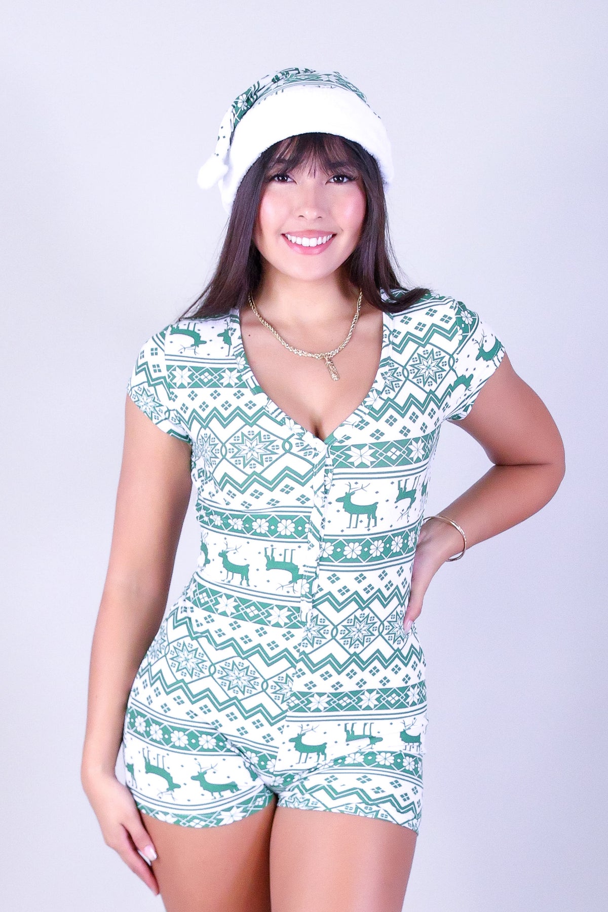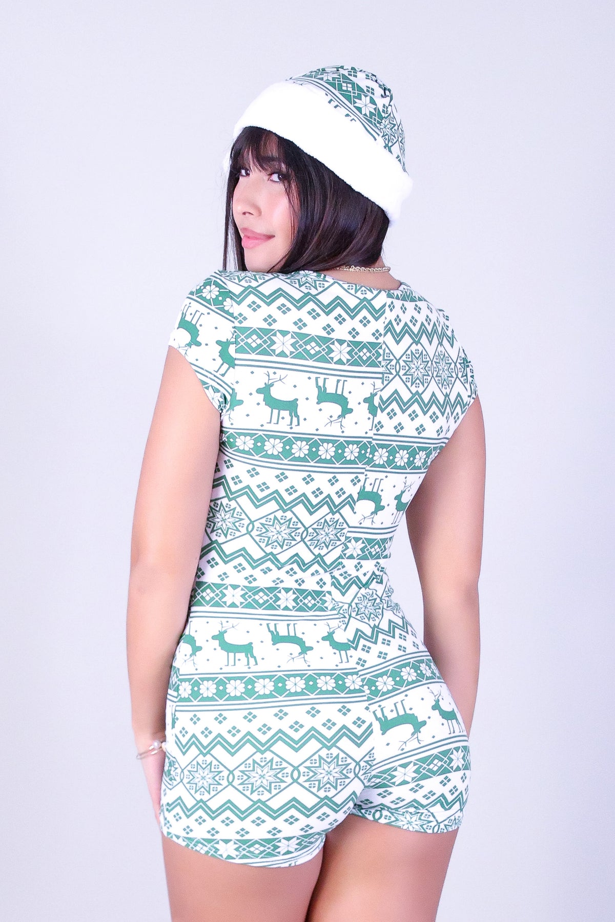 RUDOLPH DREAMS CATSUIT ROMPER w/ SANTA HAT PAJAMA is available in color GREEN and in size SMALL, MED, LARGE, XL.