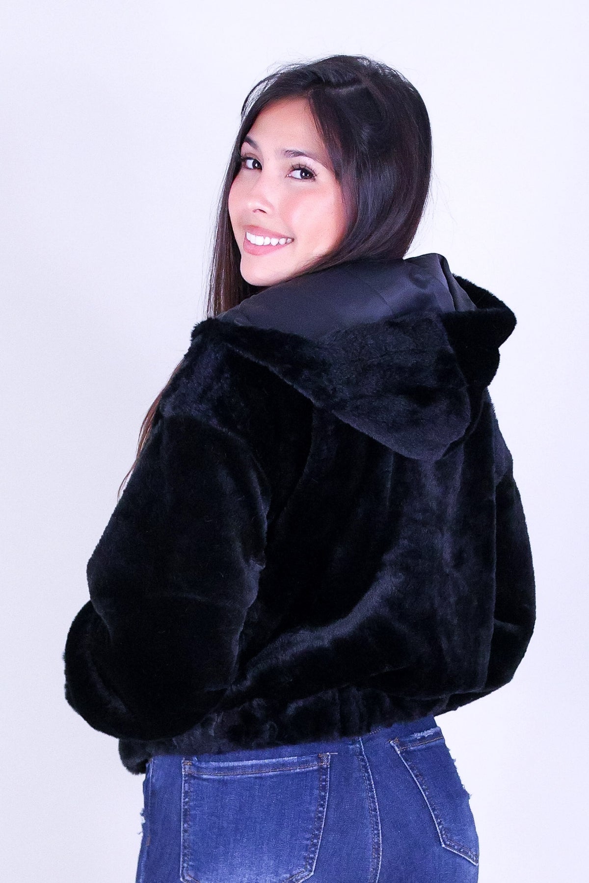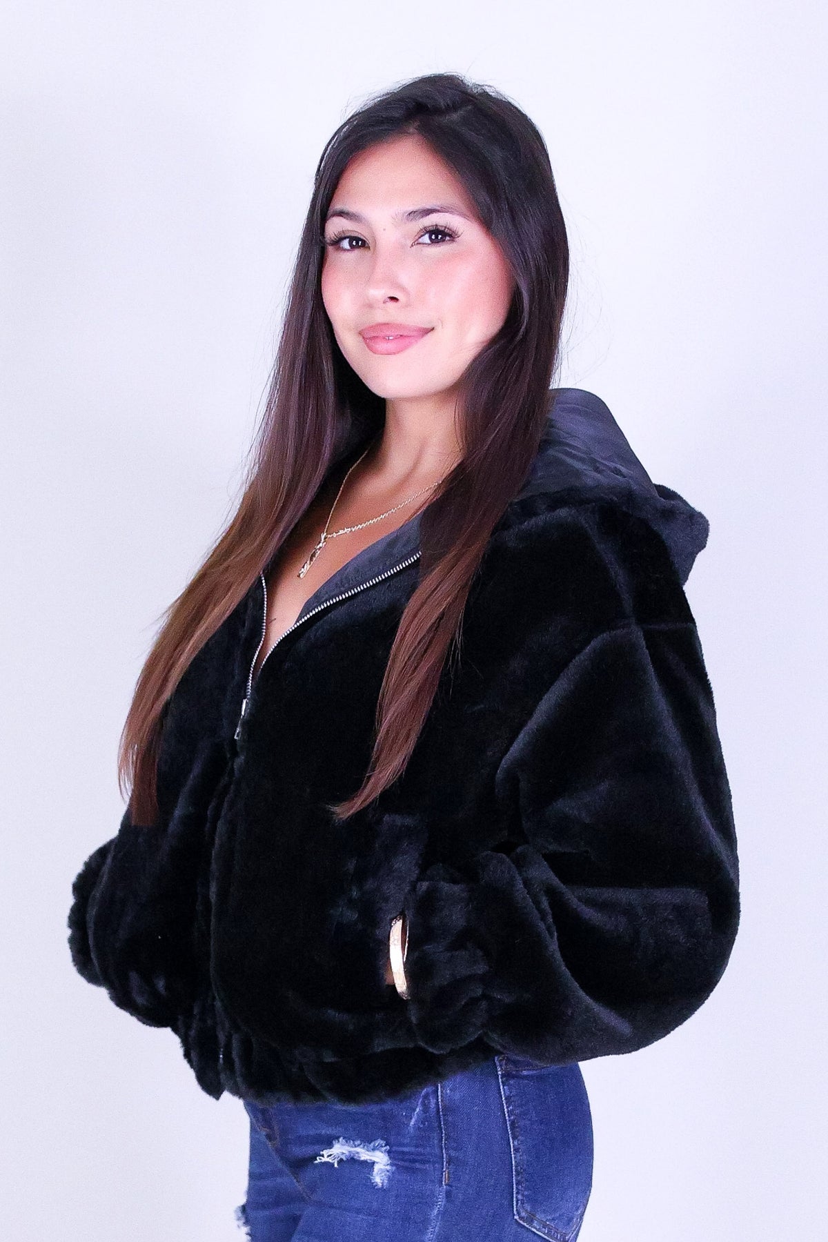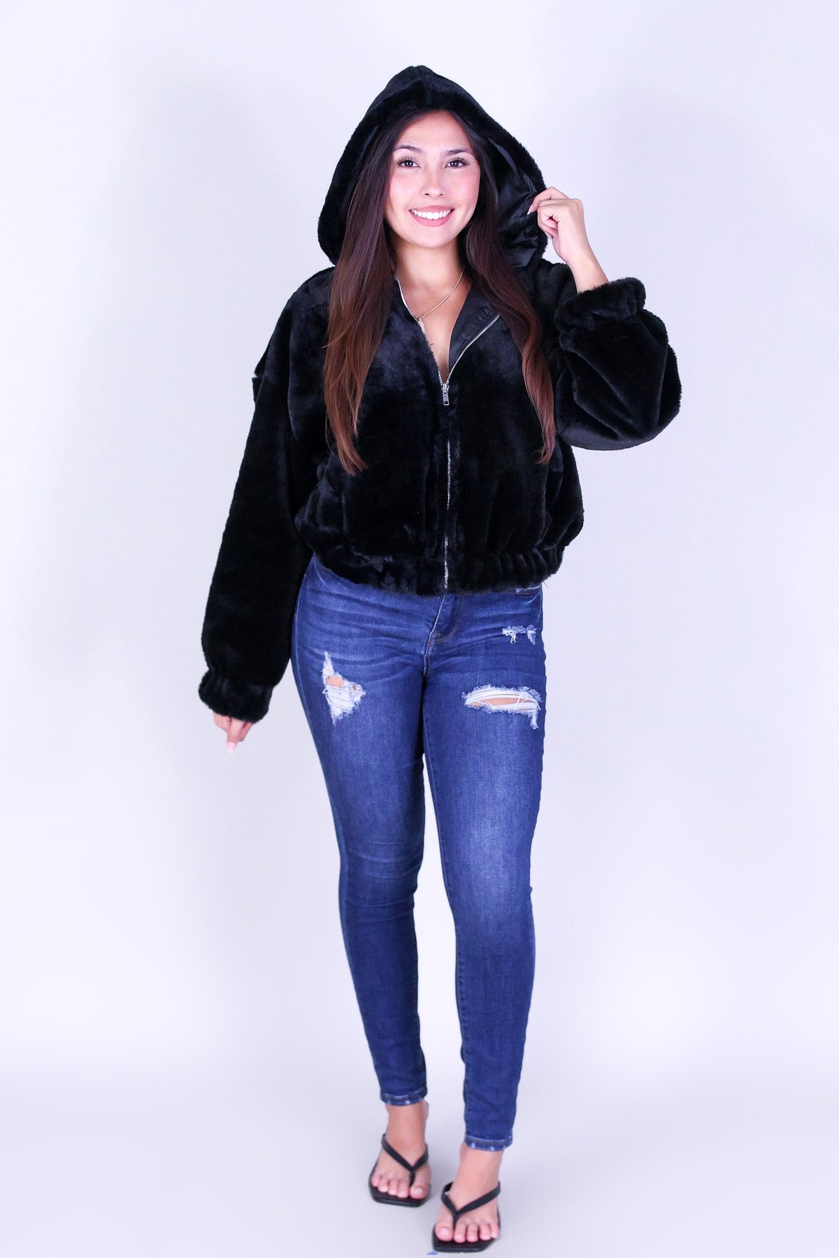 MOONLIT FAUX-FUR JACKET is available in color BLACK and in size SMALL, MED, LARGE.