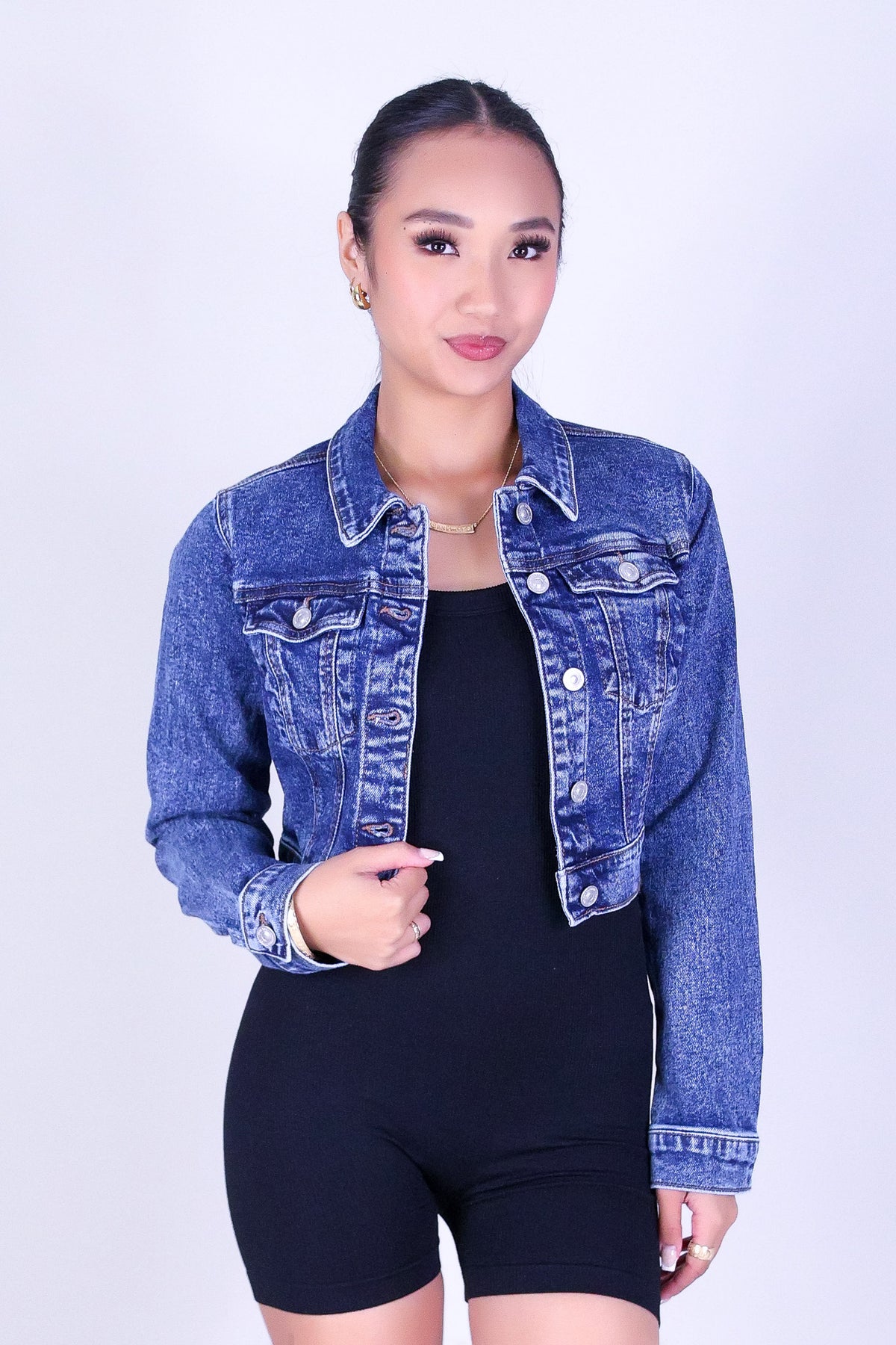 DENIM GLOW JACKET is available in color DK. S/W and in size SMALL, MED, LARGE.