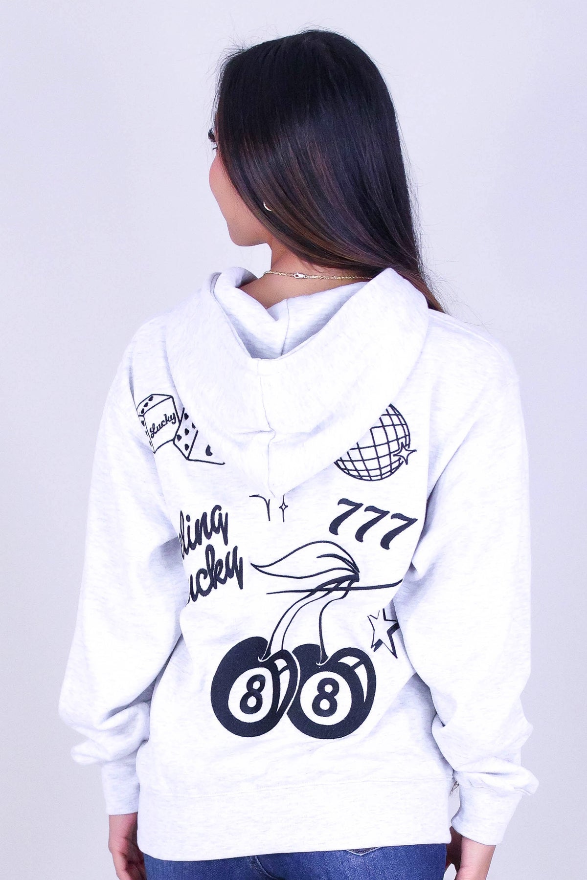 CHERRY EMBROIDERED HOODIE is available in color LT. GREY and in size SMALL, MED, LARGE.
