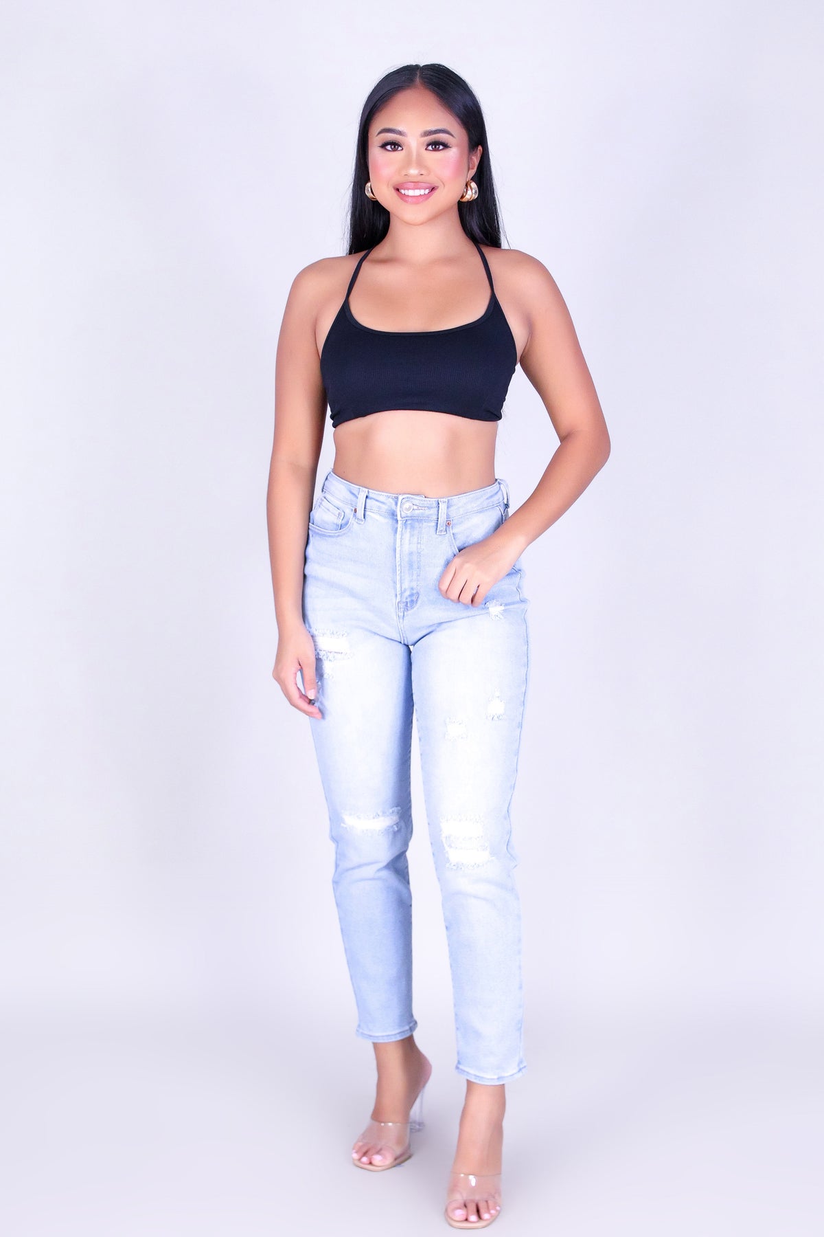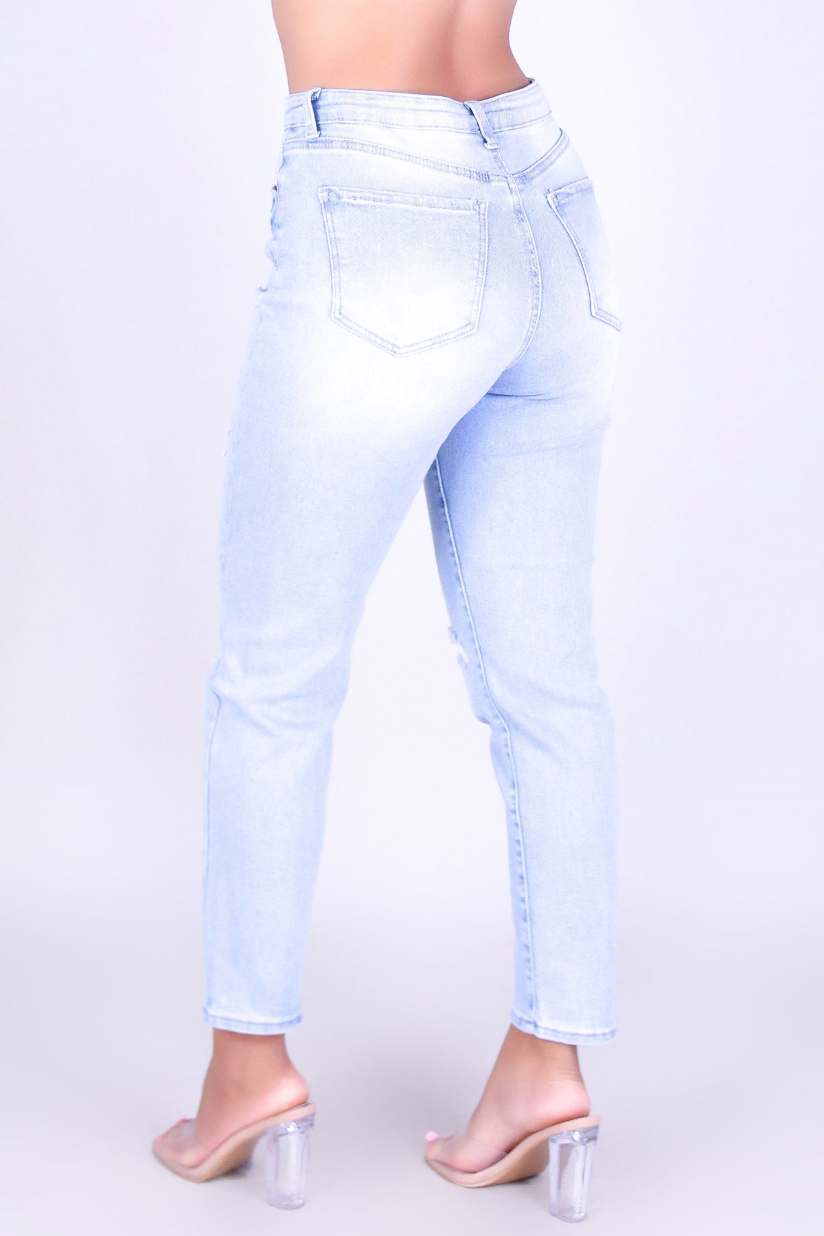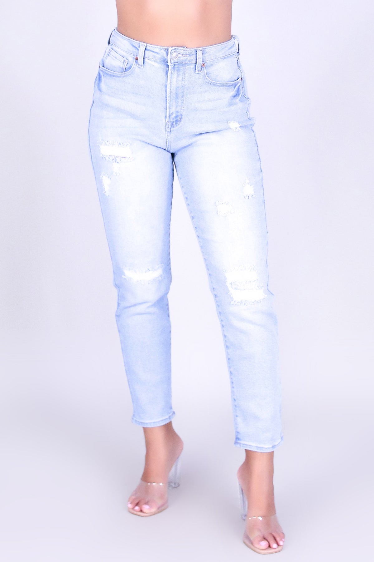 WEEKEND BLUES MOM JEANS is available in color LT S/W and in size 1, 3, 5, 7, 9, 11, 13.
