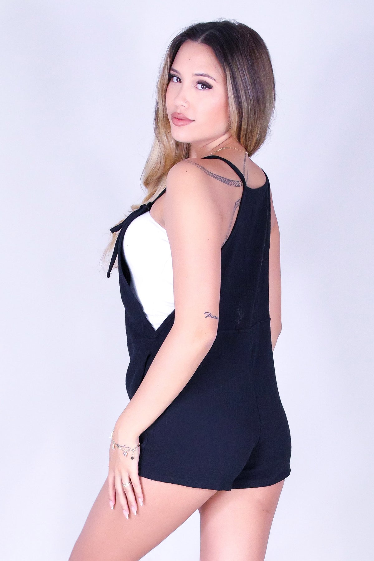 DAY OFF DAZE OVERALL ROMPER is available in color BLACK and in size SMALL, MED, LARGE, XL.