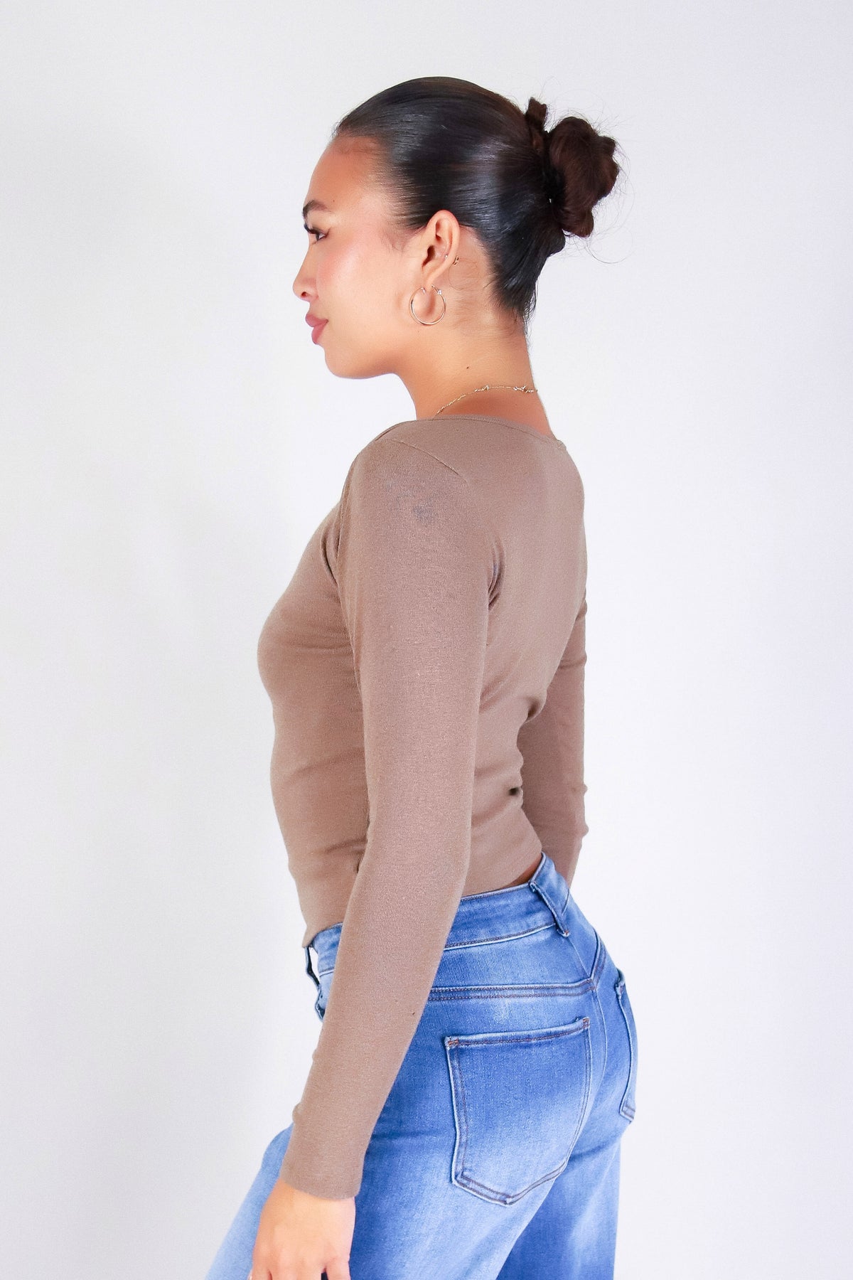 QUIET ALLURE LONG SLEEVE TOP is available in color LT. BROWN and in size SMALL, MED, LARGE.