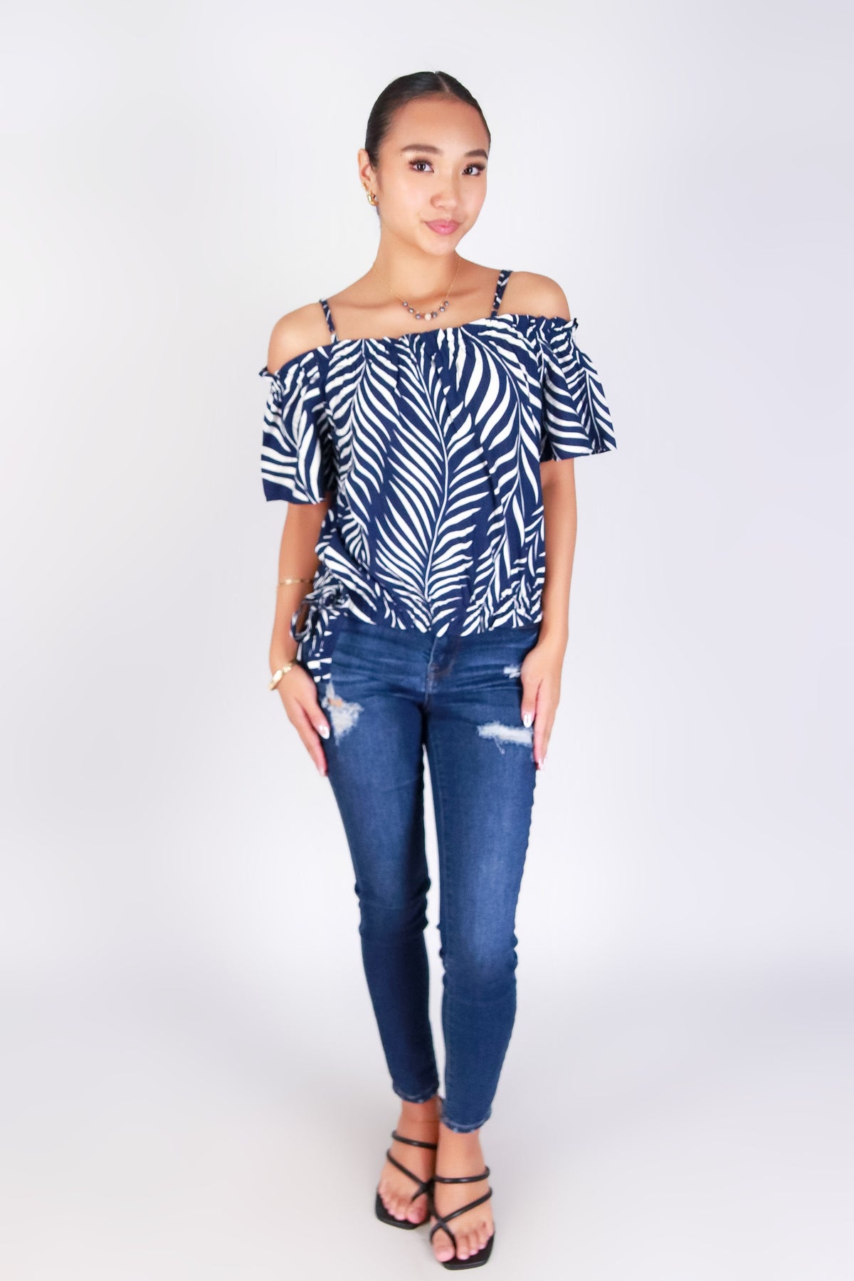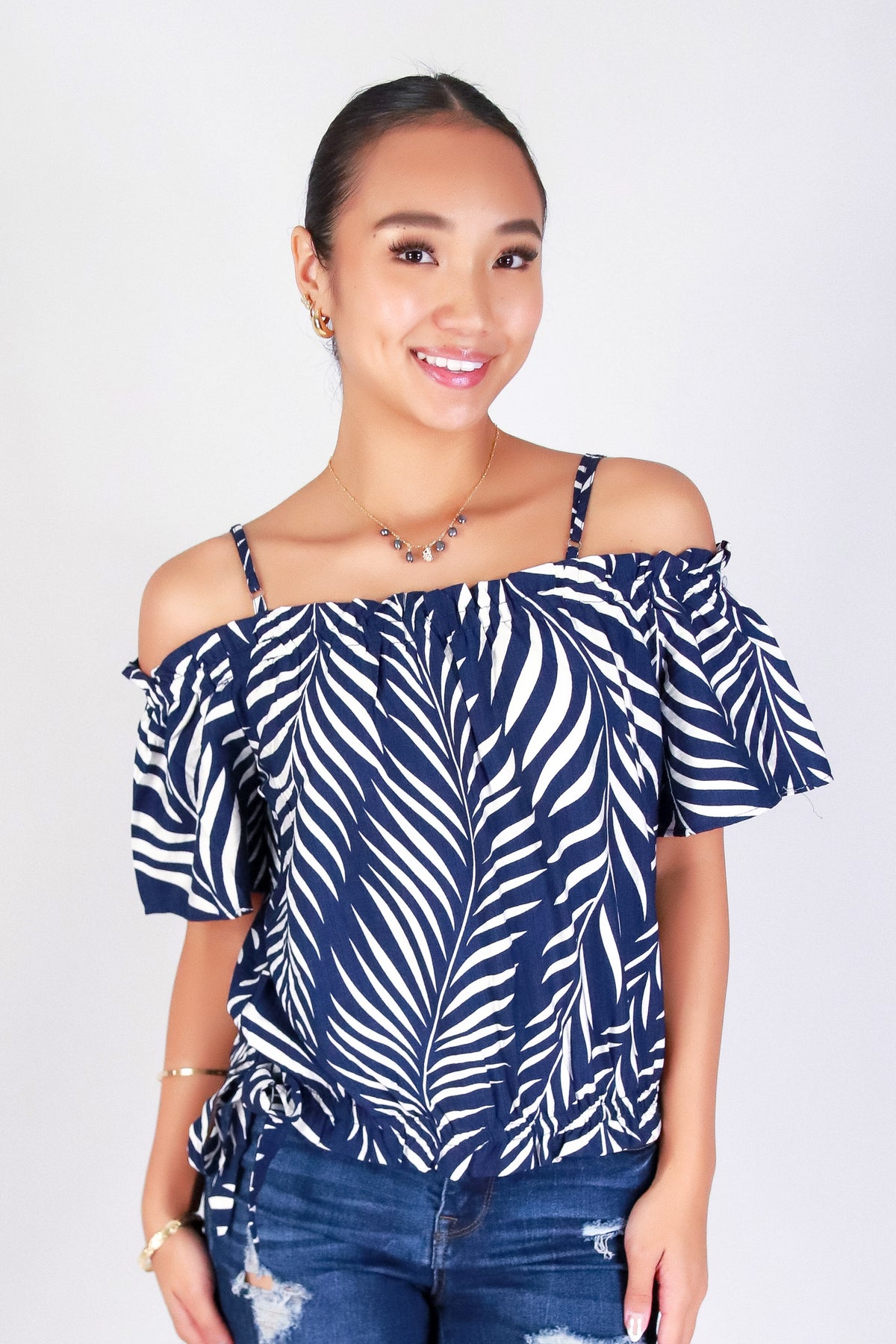 PARADISE GLOW COLD SHOULDER TOP is available in color NAVY and in size SMALL, MED, LARGE.