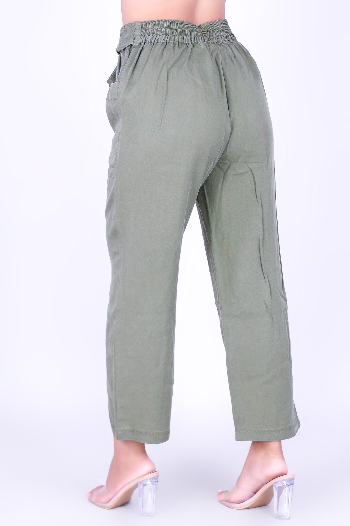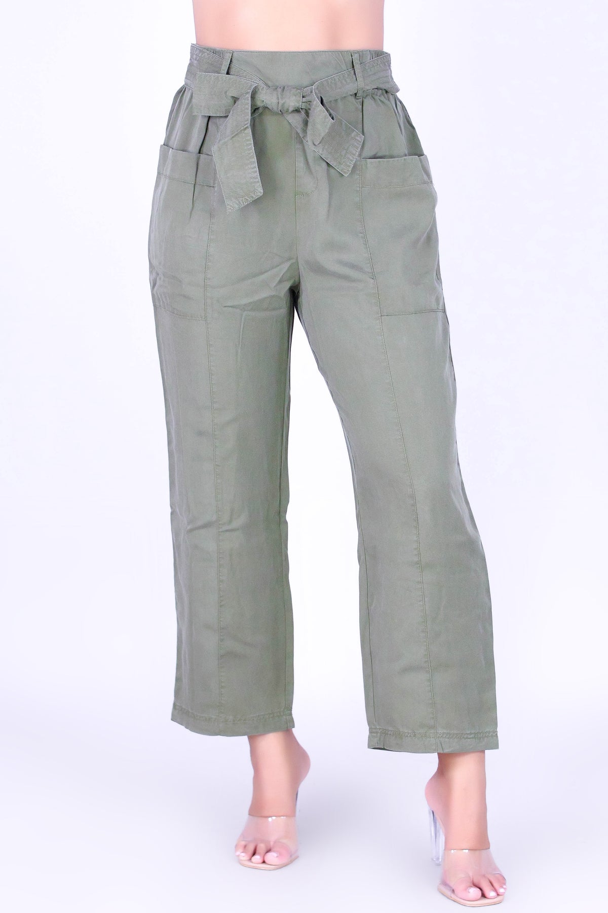 DAISY TIE WAIST PANTS is available in color OLIVE and in size SMALL, MED, LARGE.